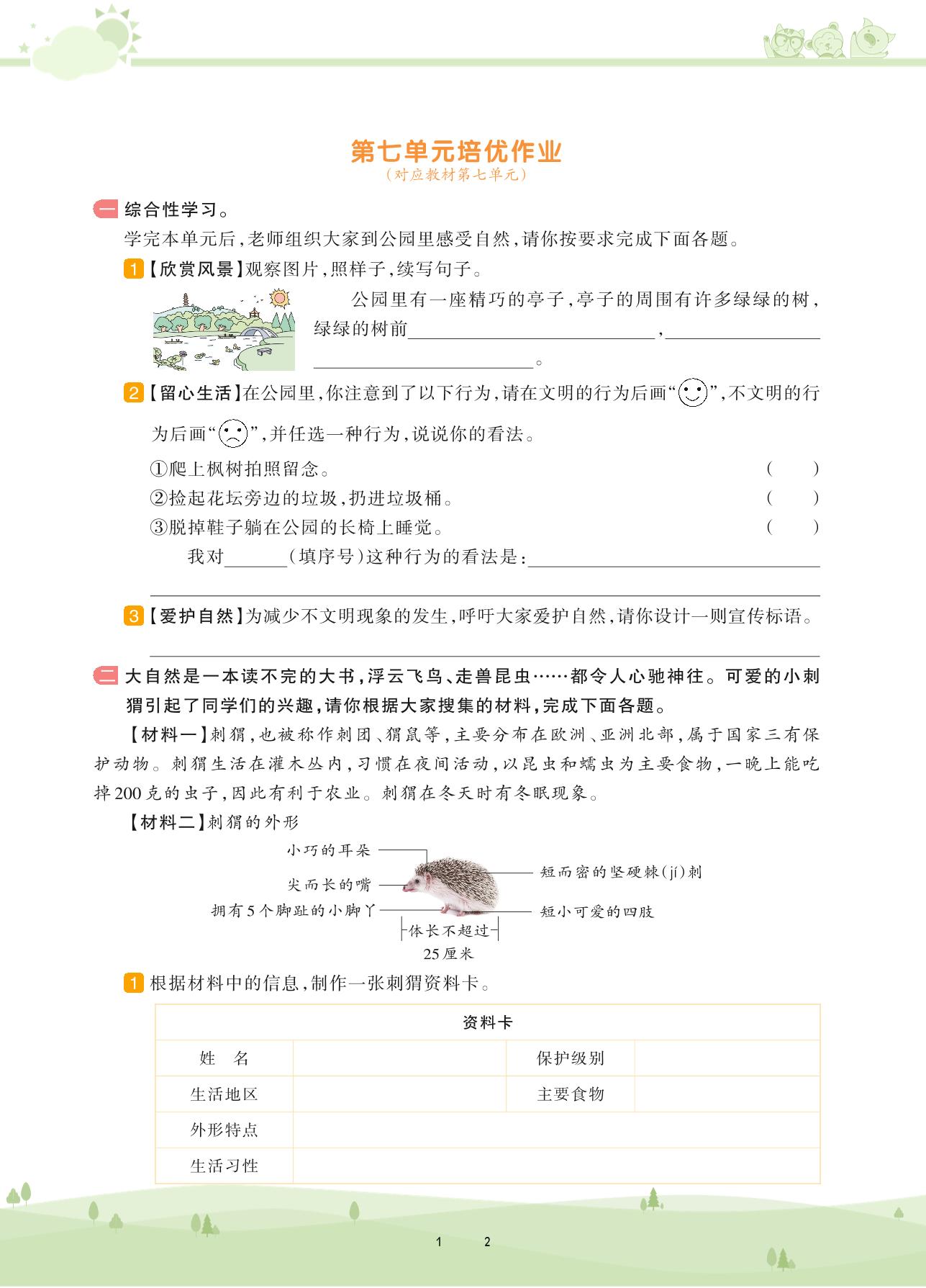 2020上册三年级语文人教版 第七单元培优作业