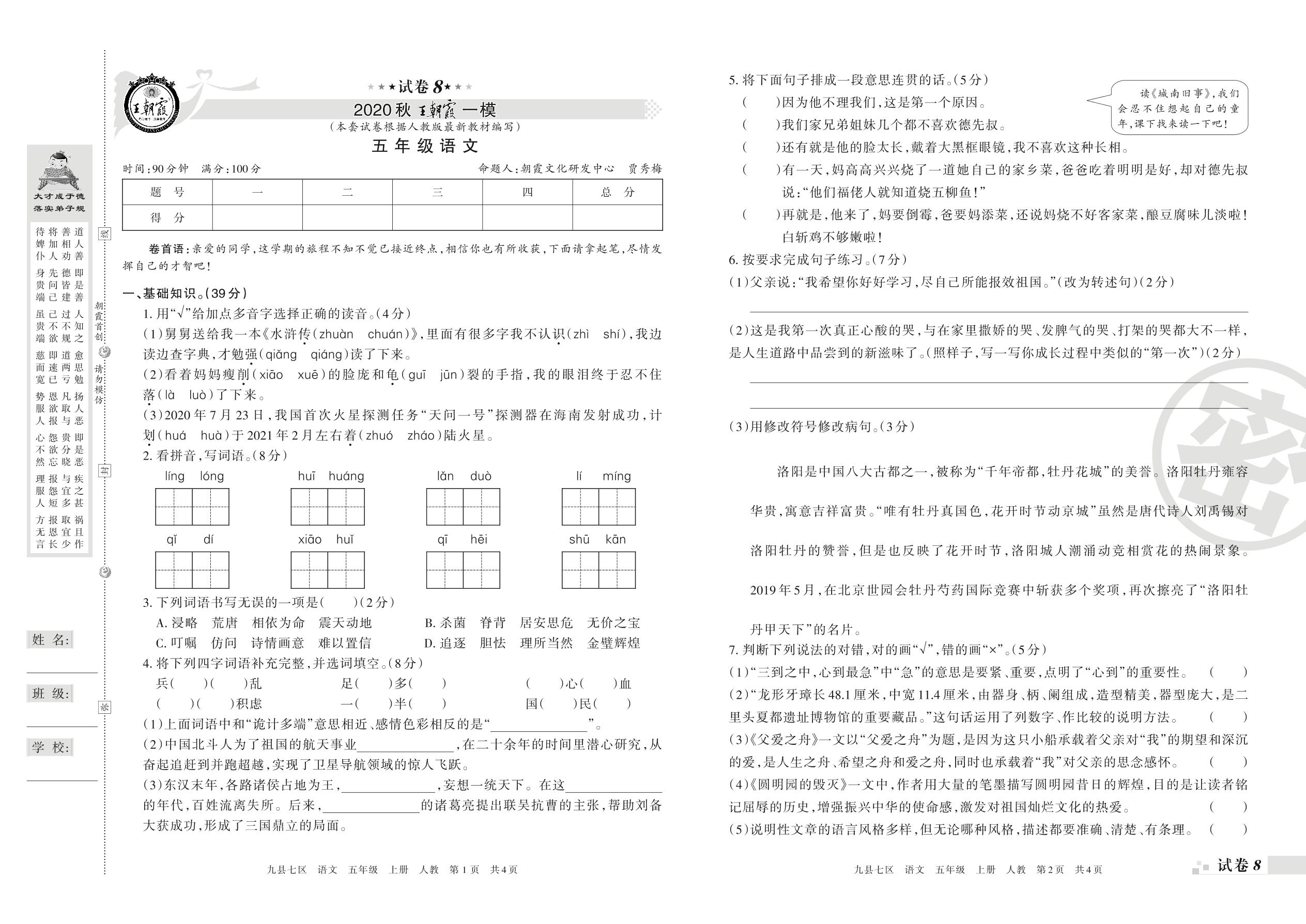 王朝霞期末模拟卷五年级上册语文(人教版)【8】