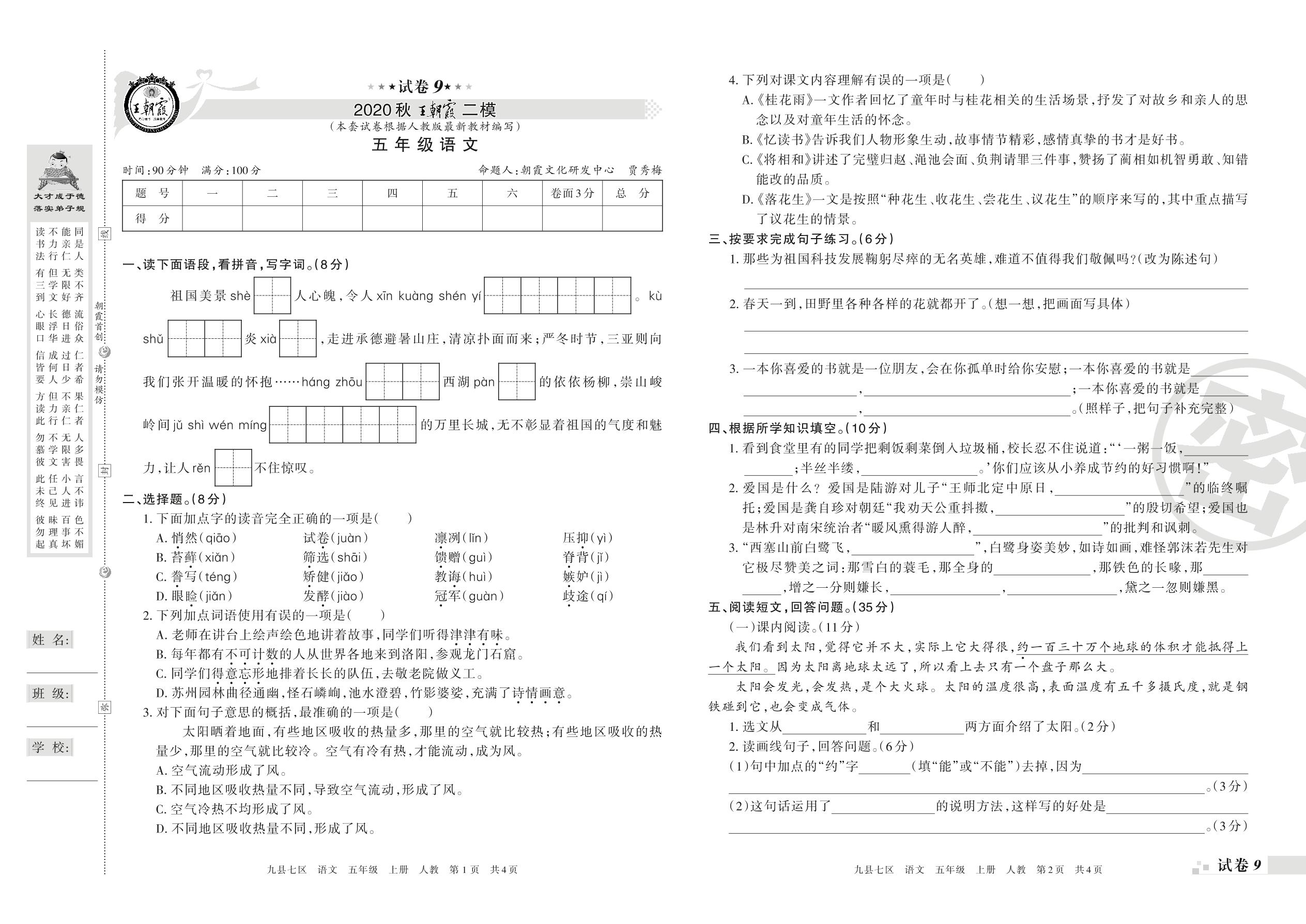 王朝霞期末模拟卷五年级上册语文(人教版)【9】