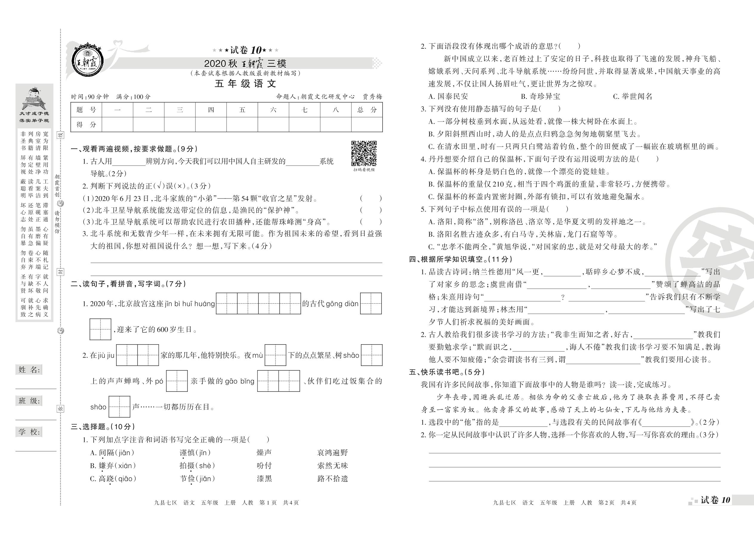 王朝霞期末模拟卷五年级上册语文(人教版)【10】