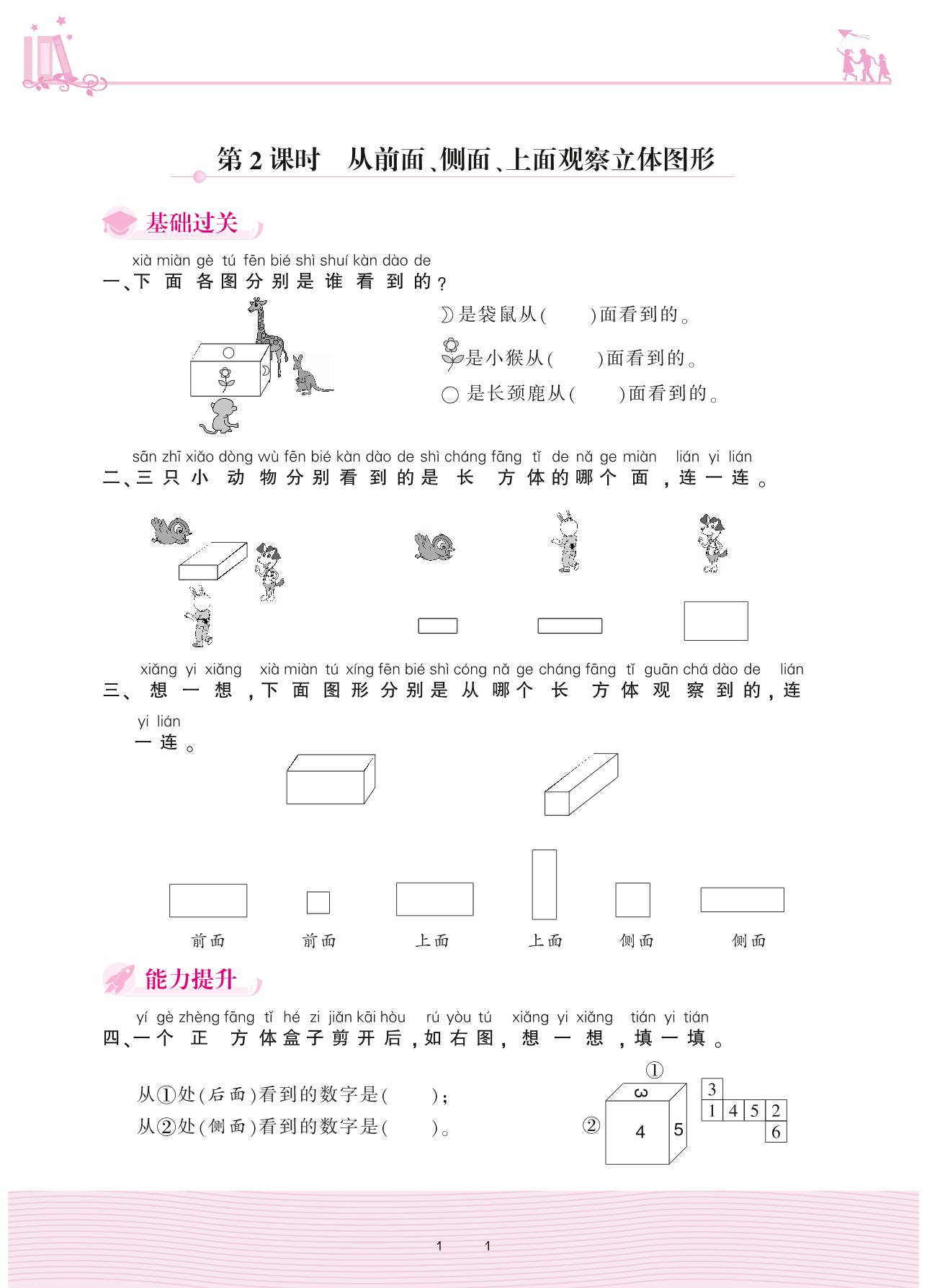 2020上册二年级数学冀教版 一 观察物体(一)——第2课时 从前面、侧面、上面观察立体图形