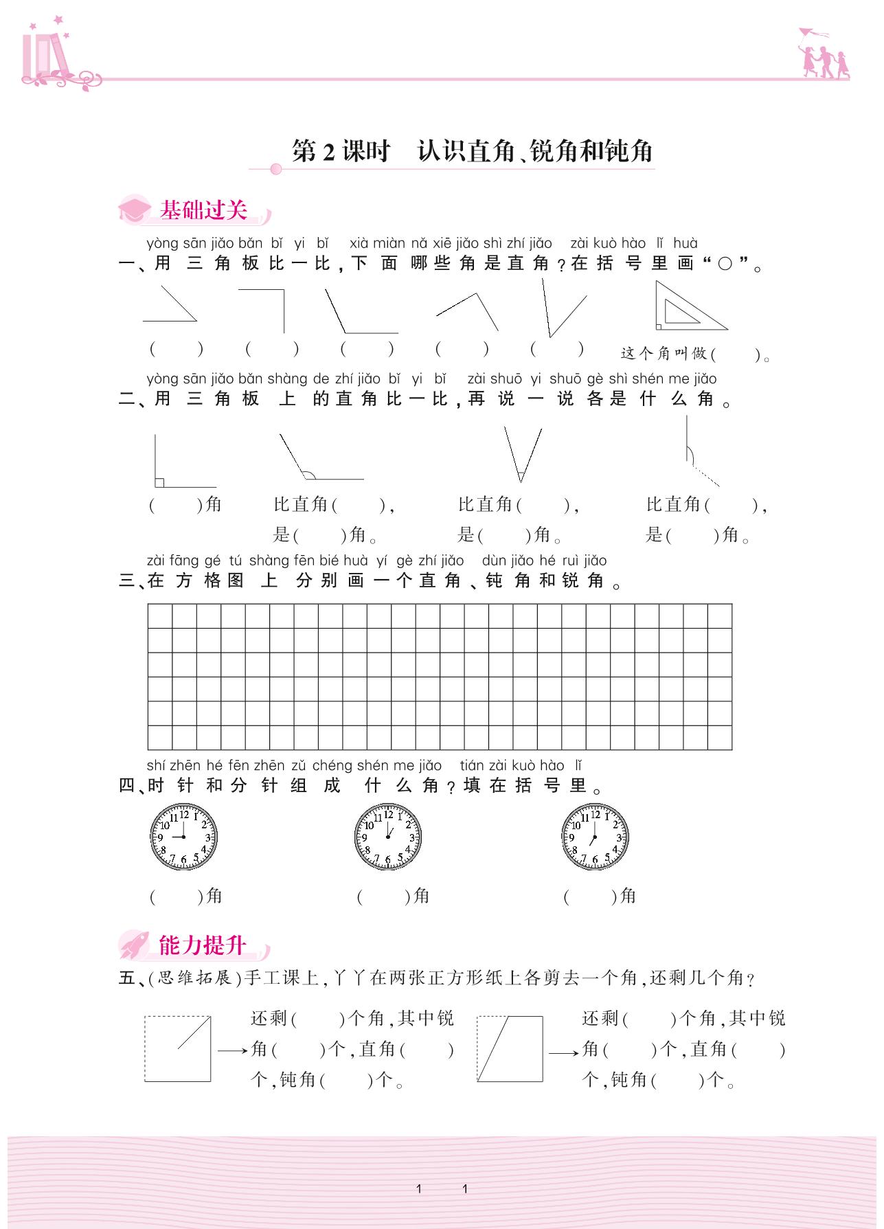 2020上册二年级数学冀教版 四 角的认识——第2课时 认识直角、锐角和钝角