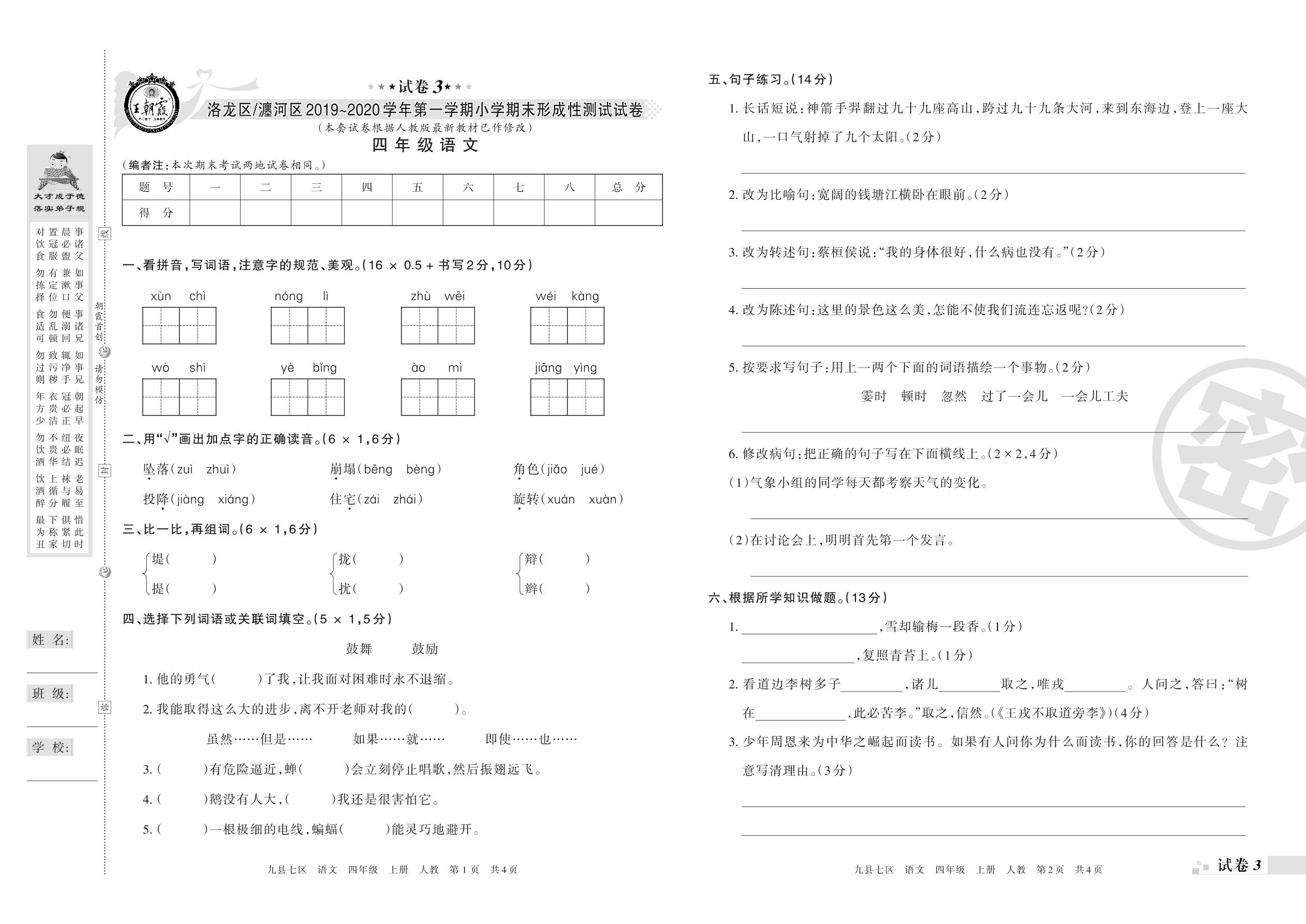 2019-2020学年第一学期洛阳市洛龙区、瀍河区四年级语文试卷(人教版)【3】
