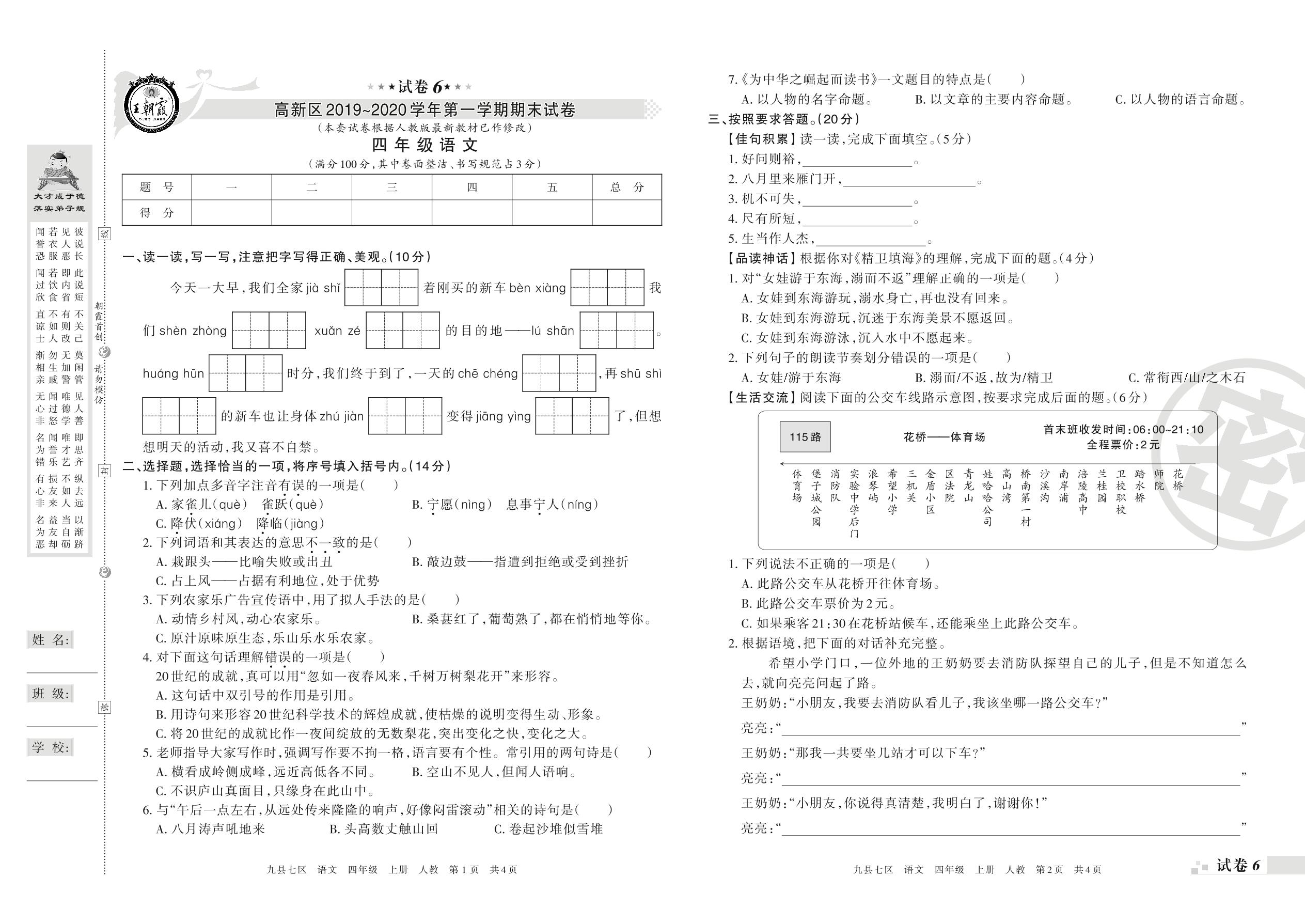 2019-2020学年第一学期洛阳市高新区四年级语文试卷(人教版)【6】