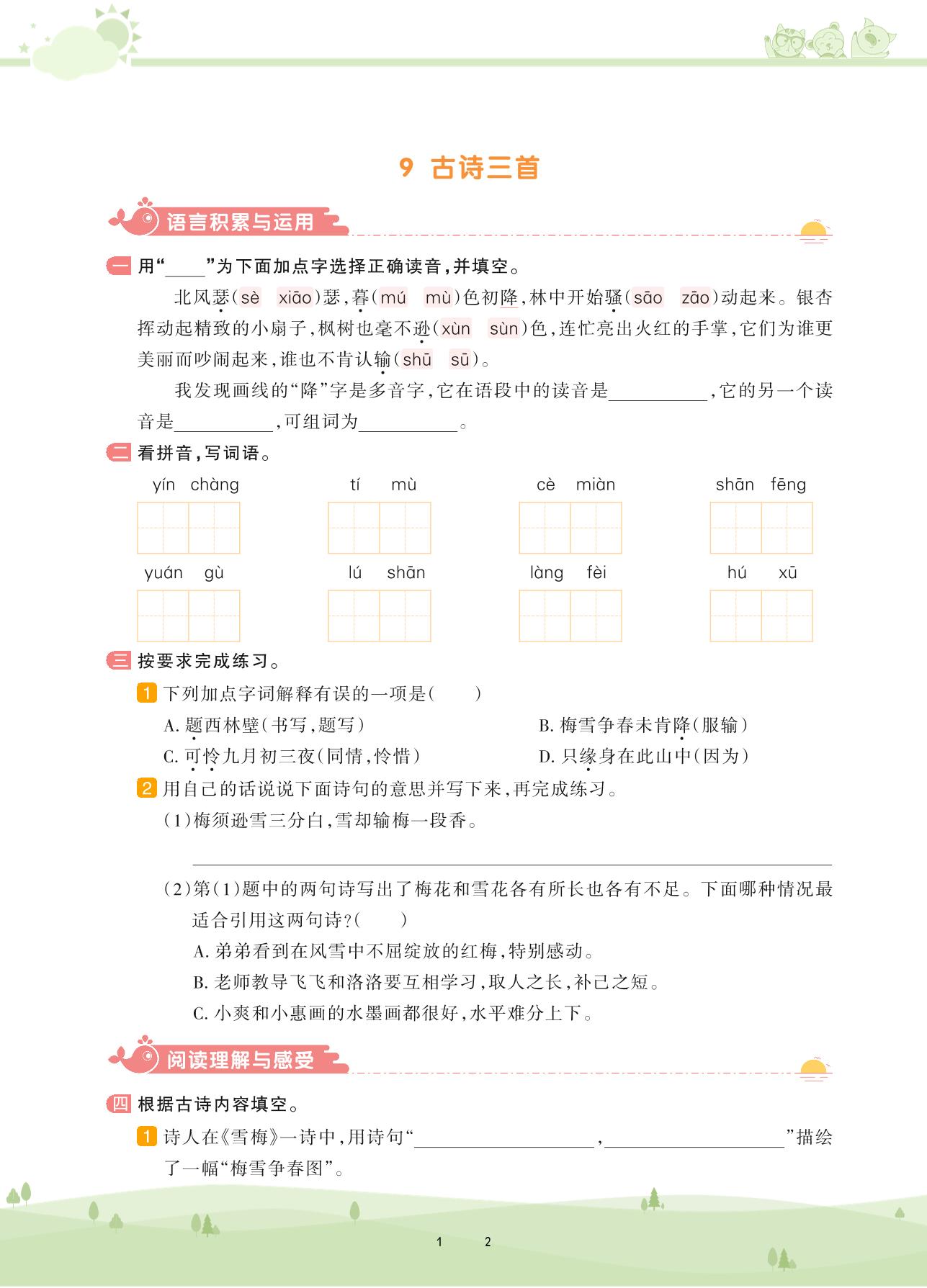 2020上册四年级语文人教版 第三单元——9 古诗三首