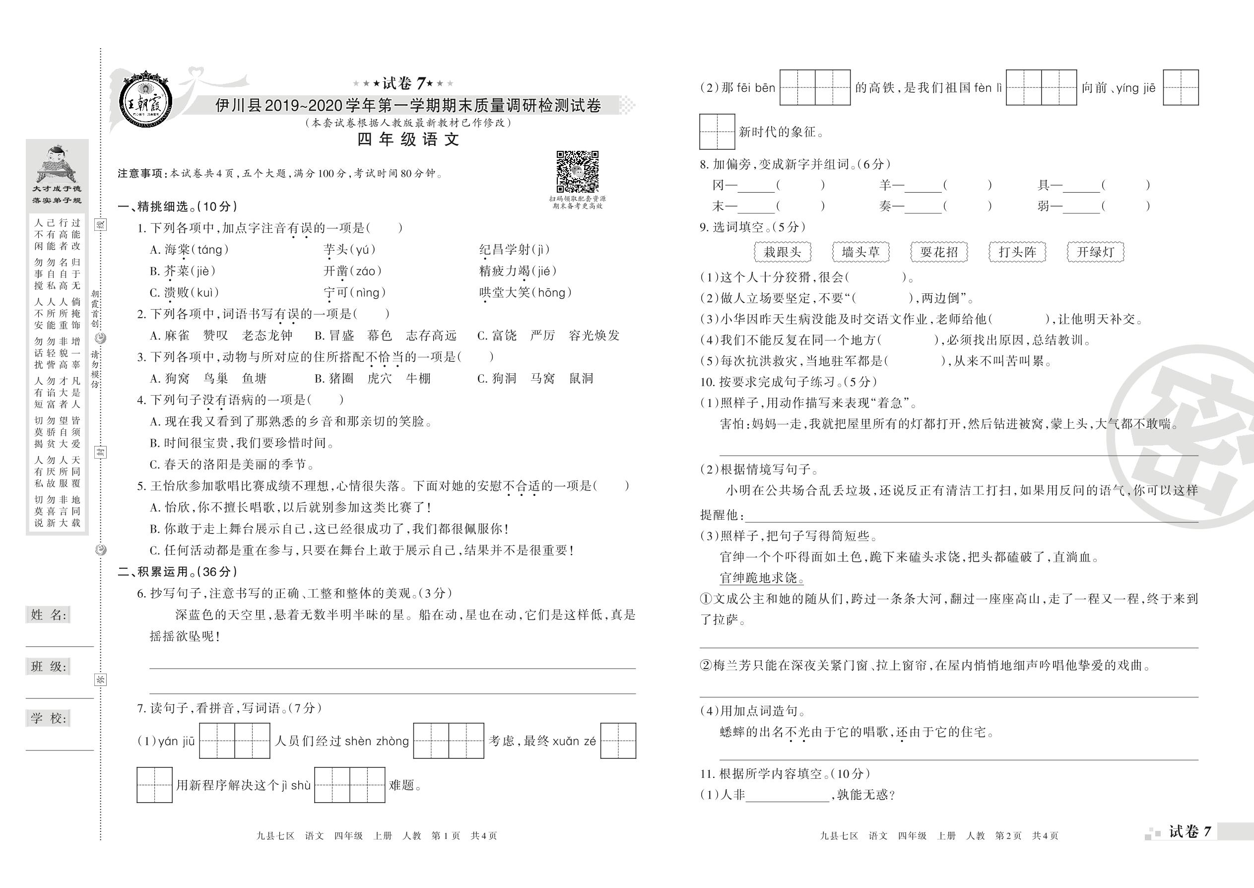 2019-2020学年第一学期洛阳市伊川县四年级语文试卷(人教版)【7】