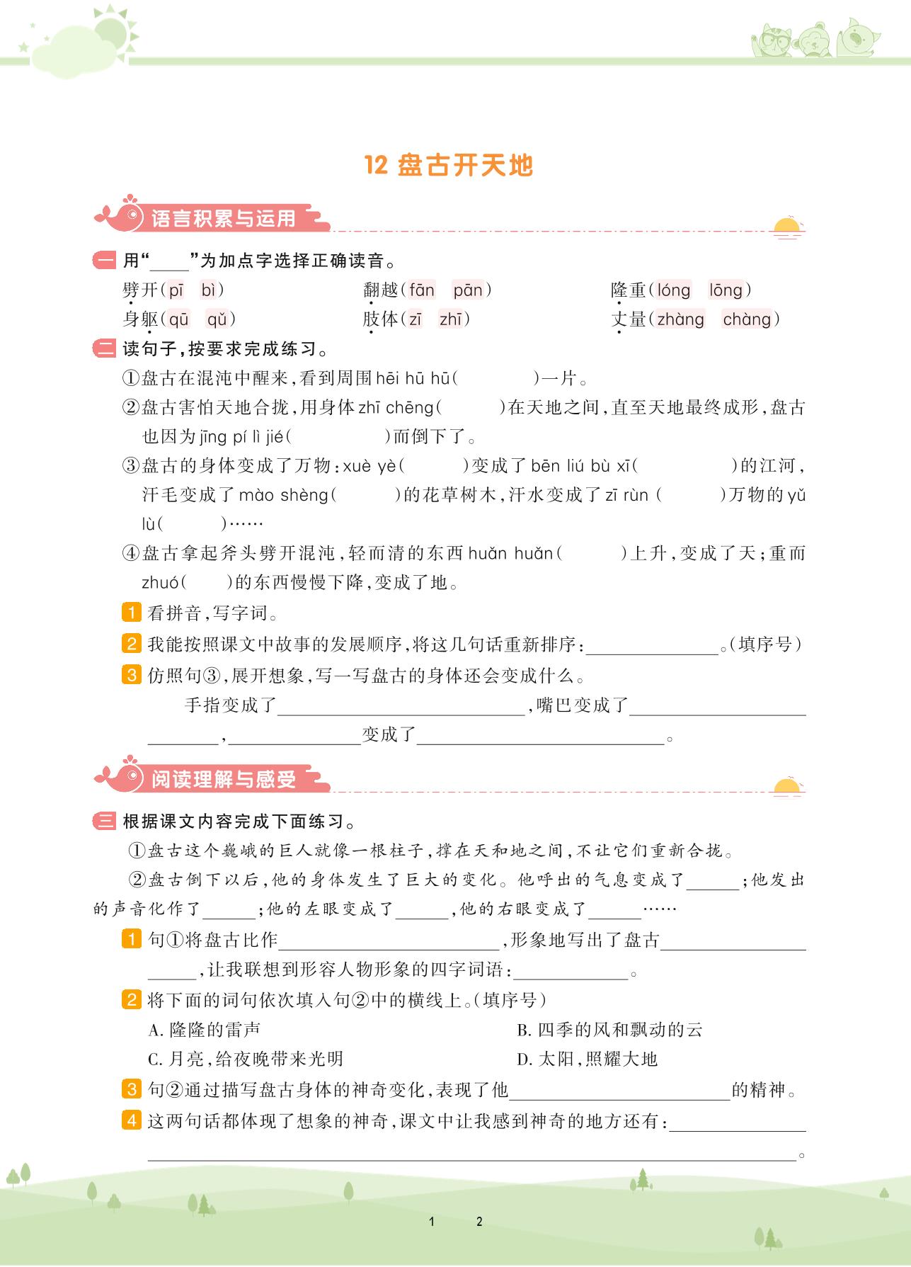 2020上册四年级语文人教版 第四单元——12 盘古开天地