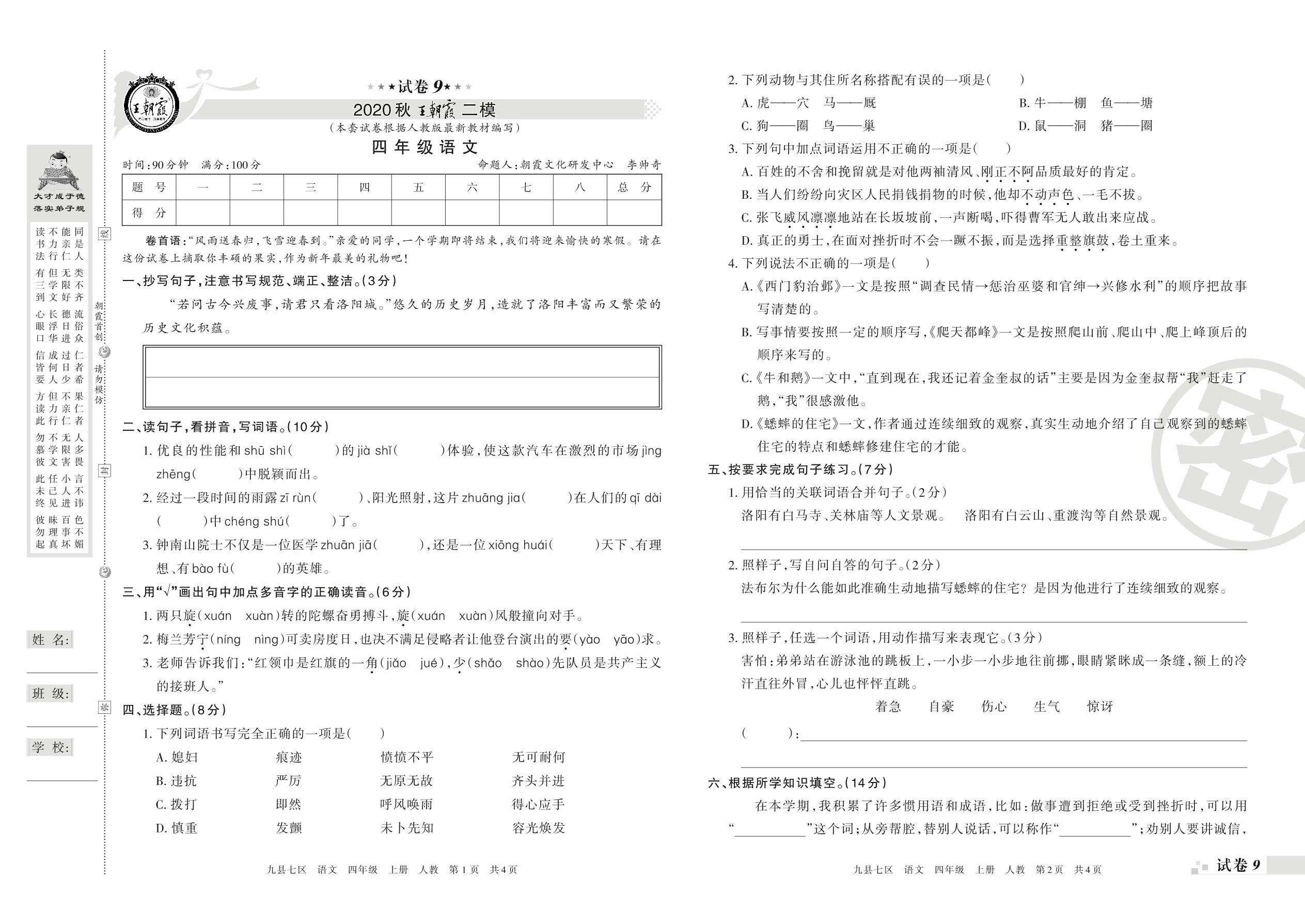 王朝霞期末模拟卷四年级上册语文(人教版)_R210801190919【9】