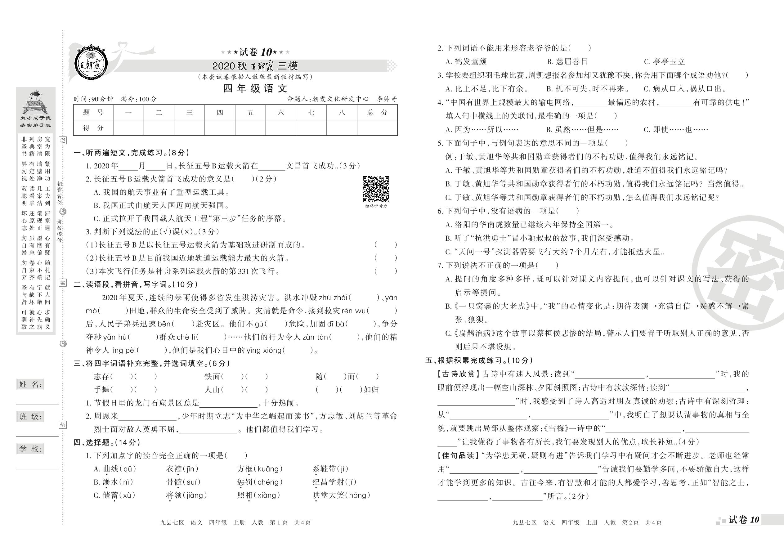 王朝霞期末模拟卷四年级上册语文(人教版)_R210801190924【10】