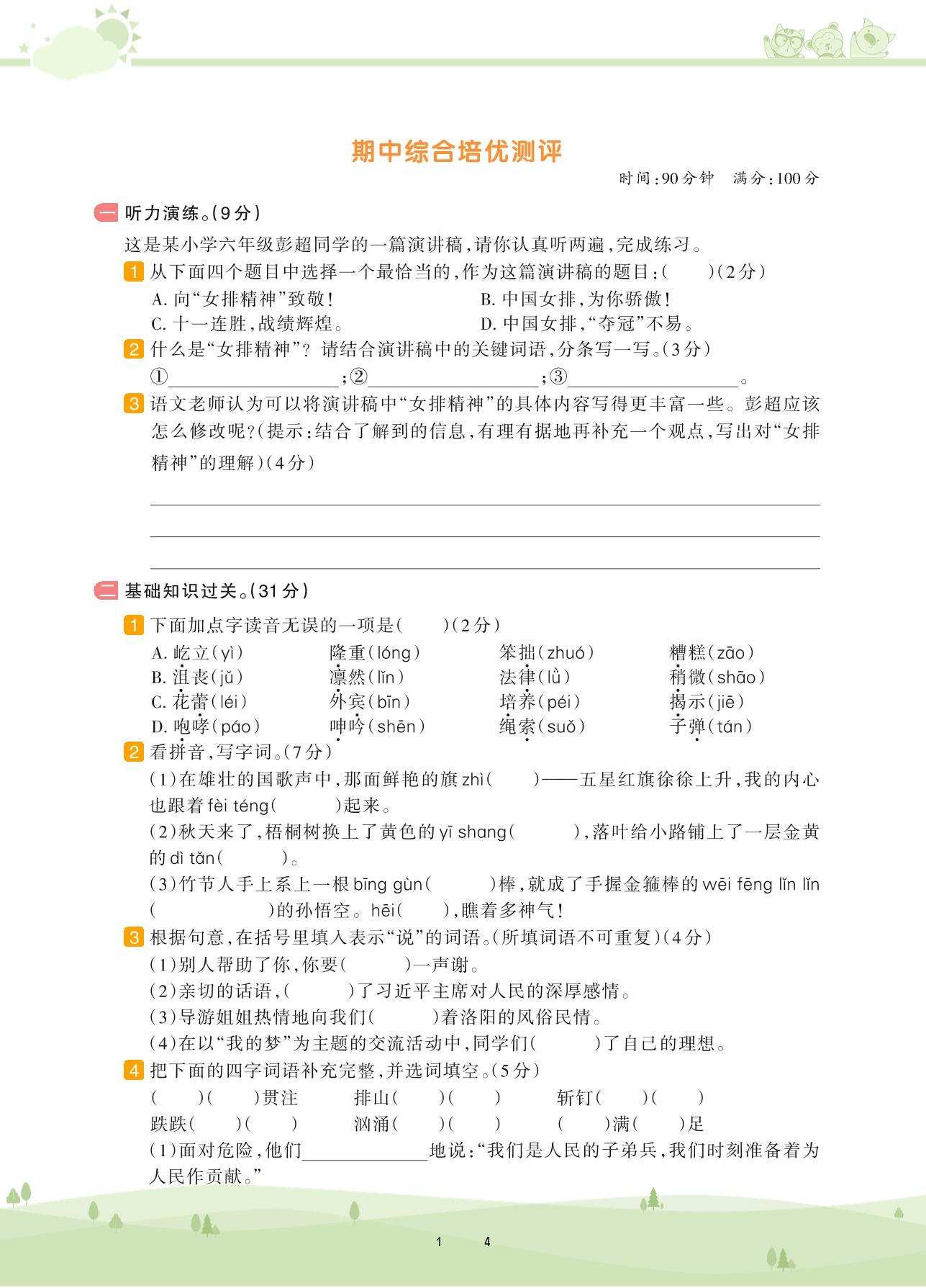 2020上册六年级语文人教版 期中综合培优测评