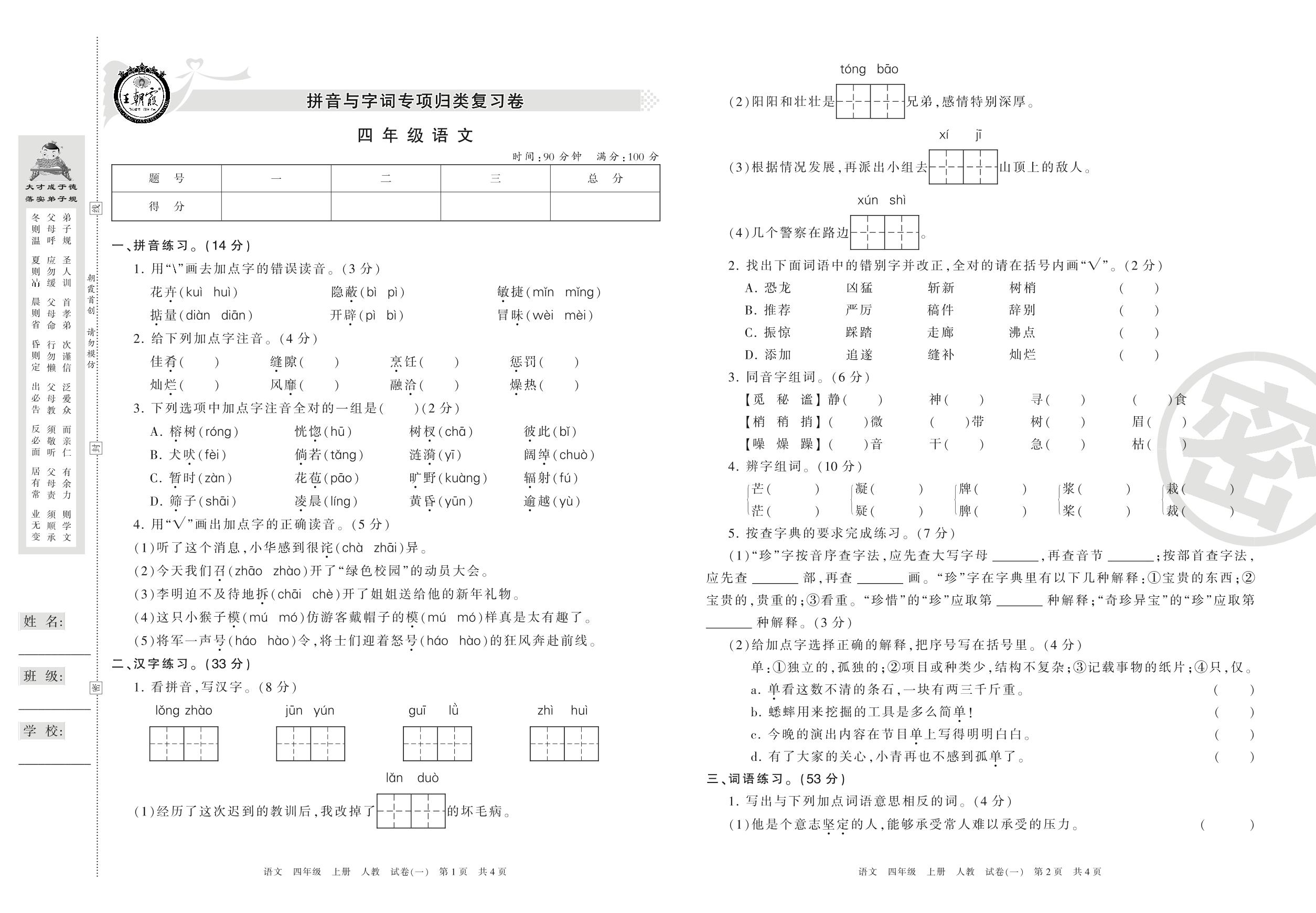 王朝霞期末专项卷——拼音与字词专项归类复习四年级上册语文(人教版)【1】