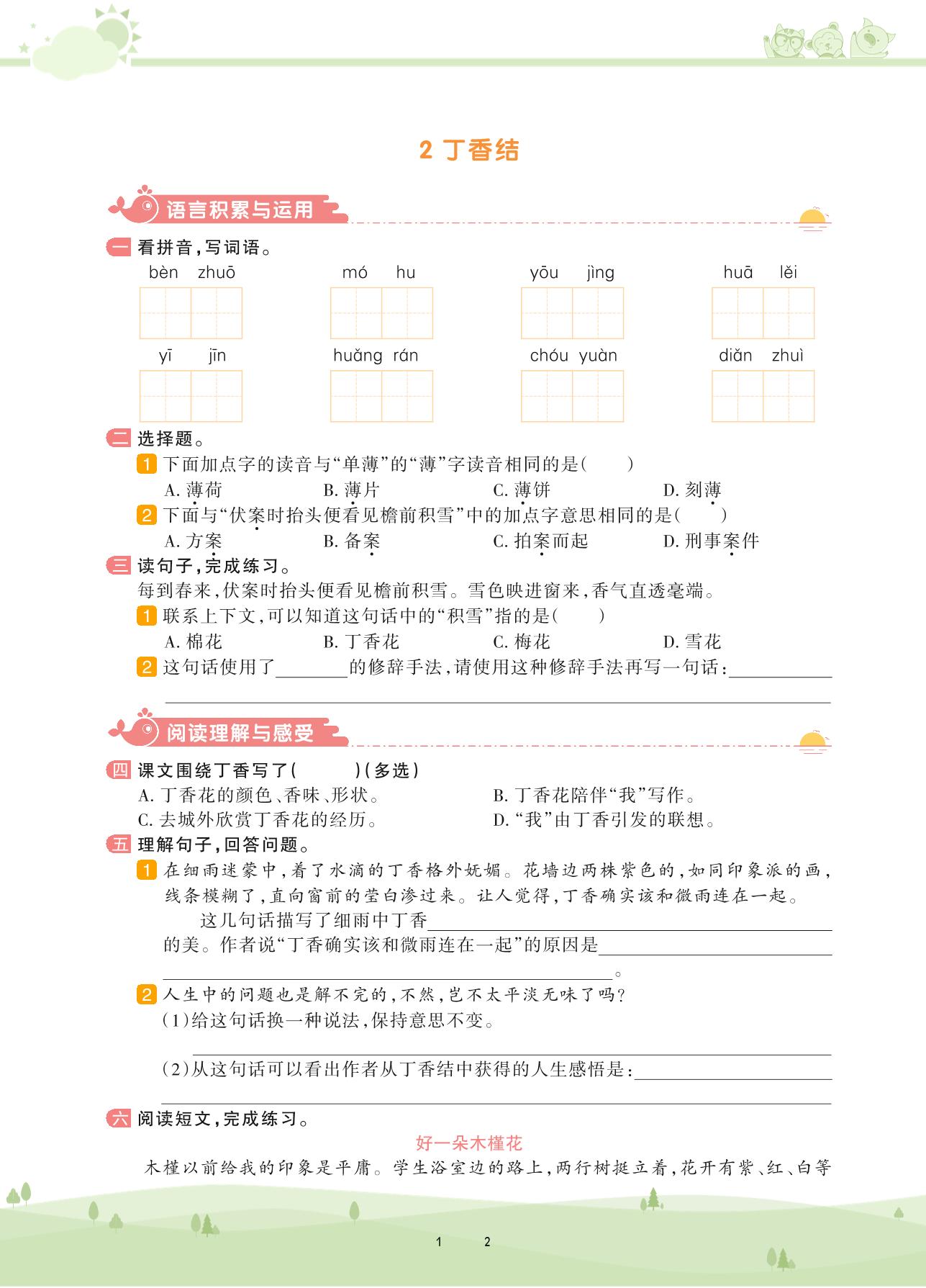 2020上册六年级语文人教版 第一单元——2 丁香结