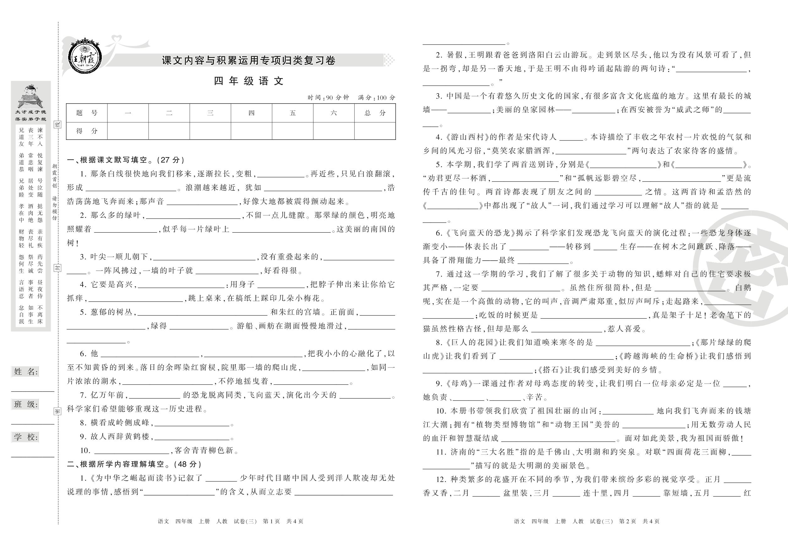 王朝霞期末专项卷——课文内容与积累运用专项归类复习四年级上册语文(人教版)【3】