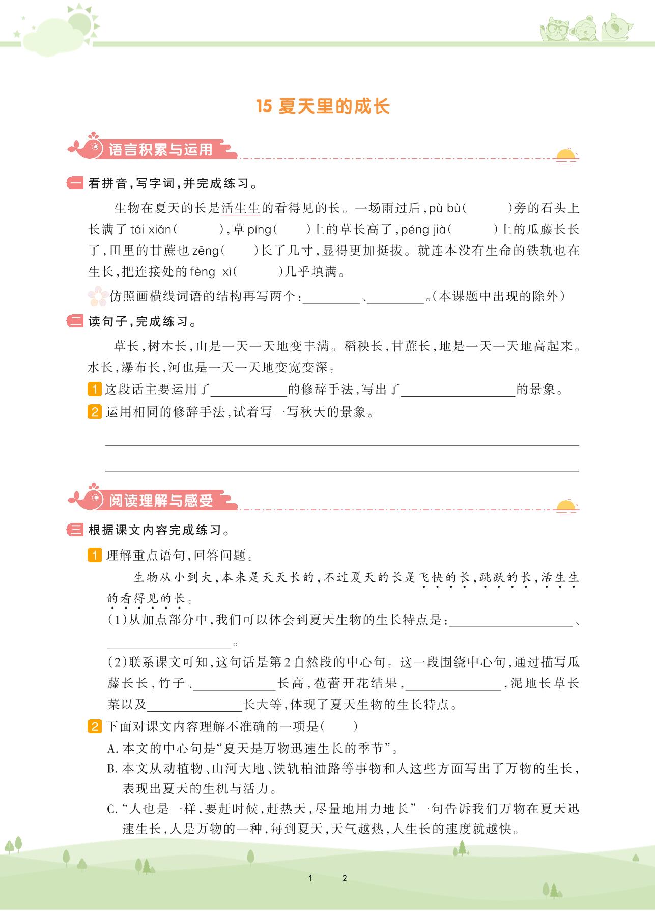 2020上册六年级语文人教版 第五单元——15 夏天里的成长
