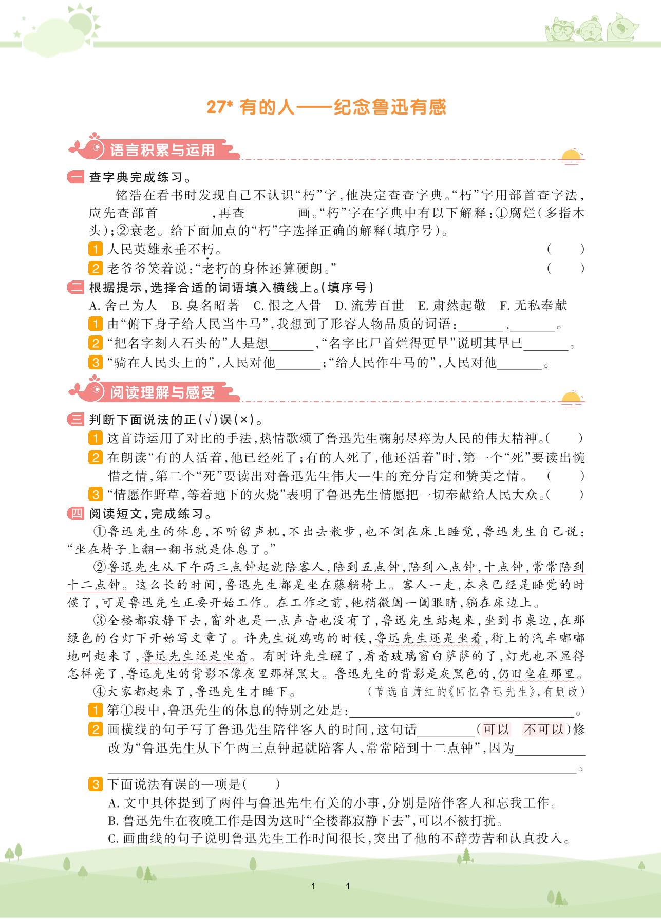2020上册六年级语文人教版 第八单元——27 有的人——纪念鲁迅有感
