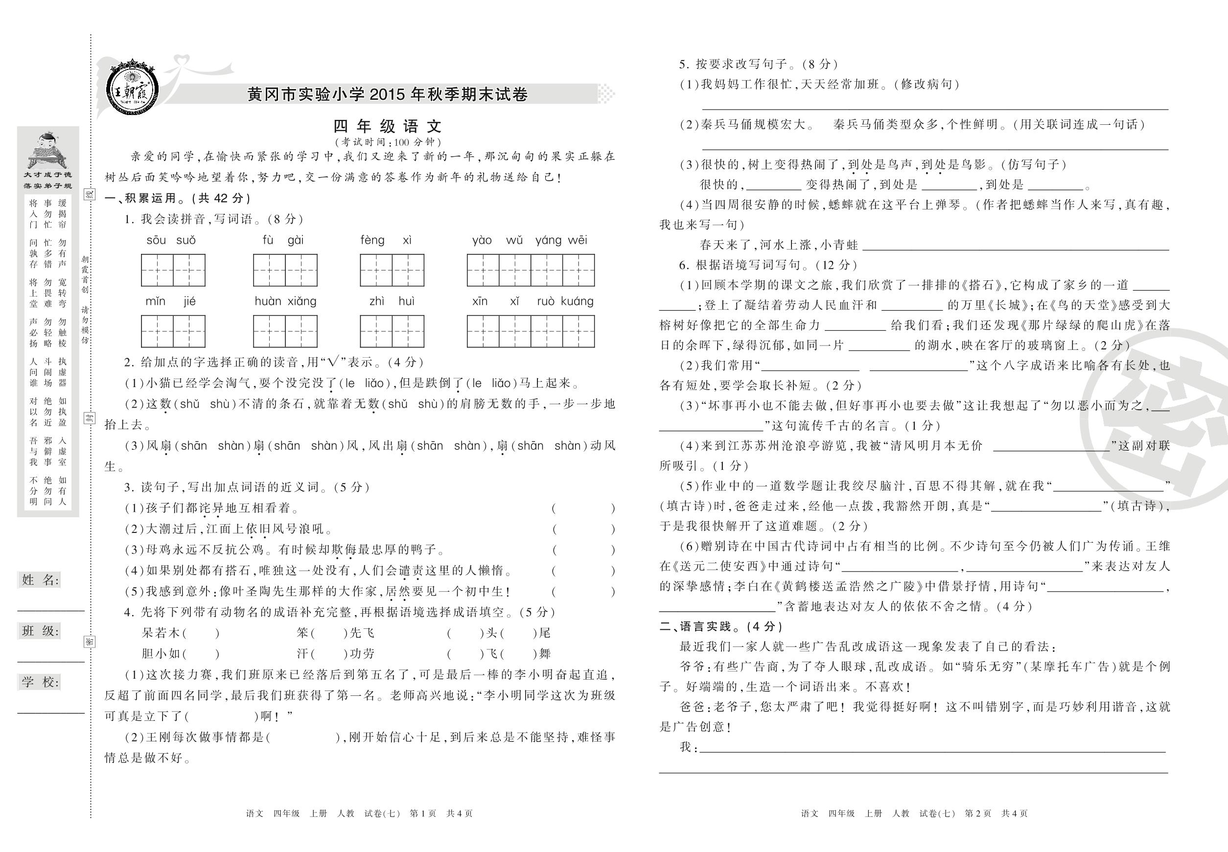 2015-2016学年第一学期黄冈市实验小学四年级语文试卷(人教版)【7】