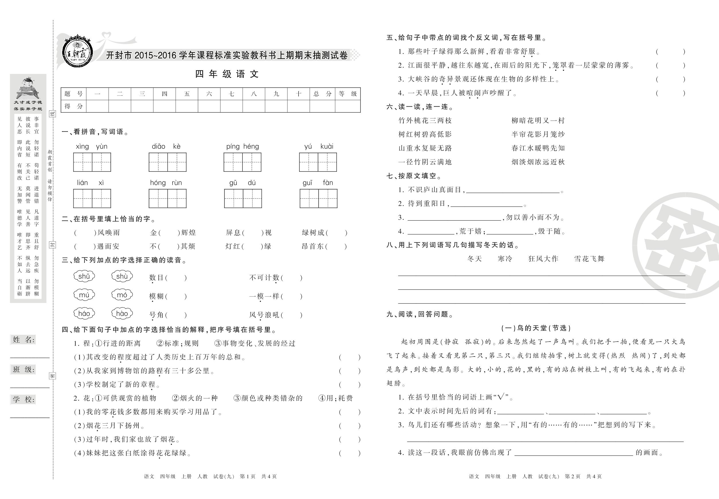 2015-2016学年第一学期开封市四年级语文试卷(人教版)【9】