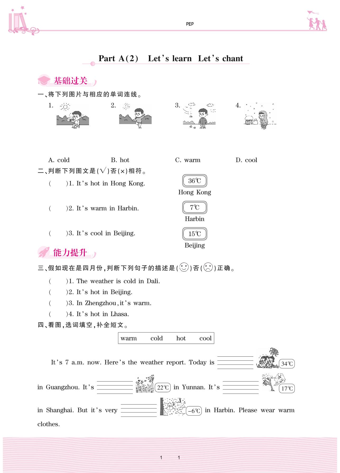 四年级英语人教PEP版(三起始)下册课时作业