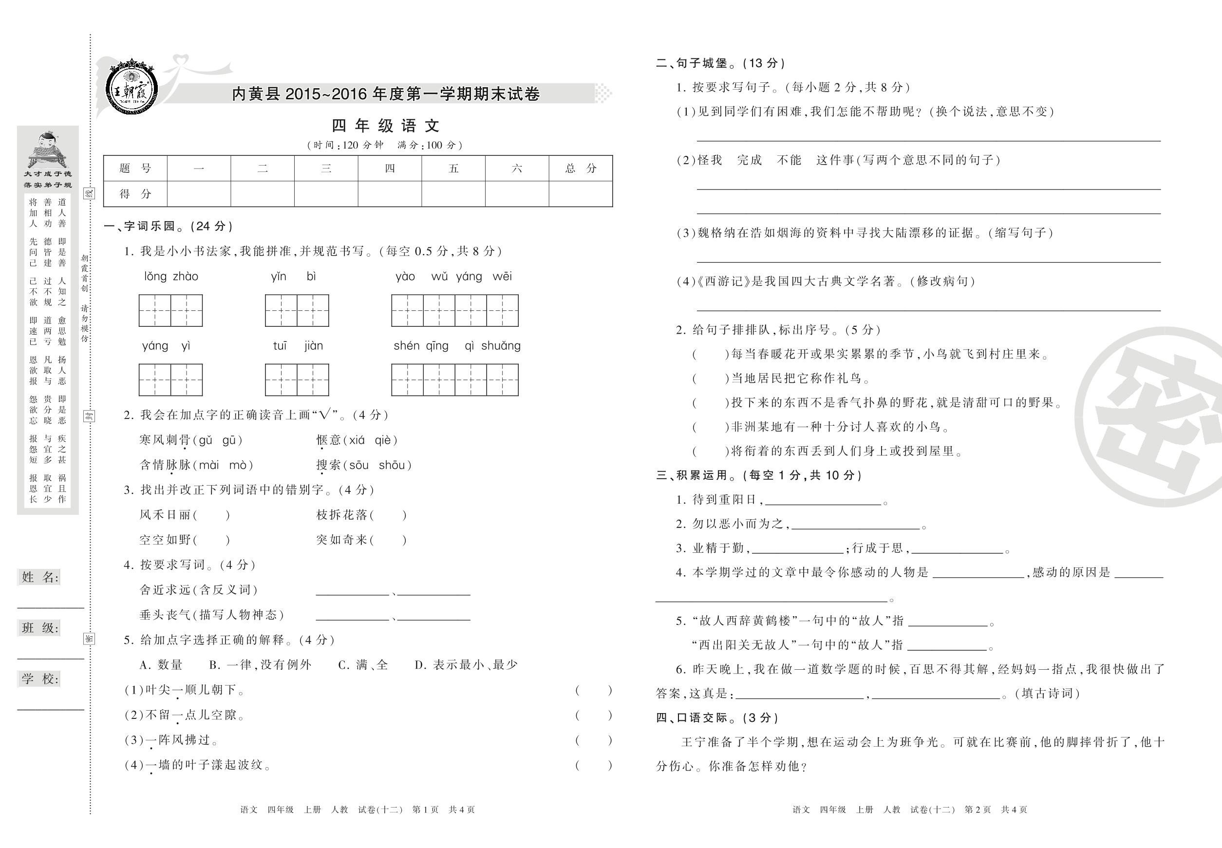 2015-2016学年第一学期安阳市内黄县四年级语文试卷(人教版)【12】
