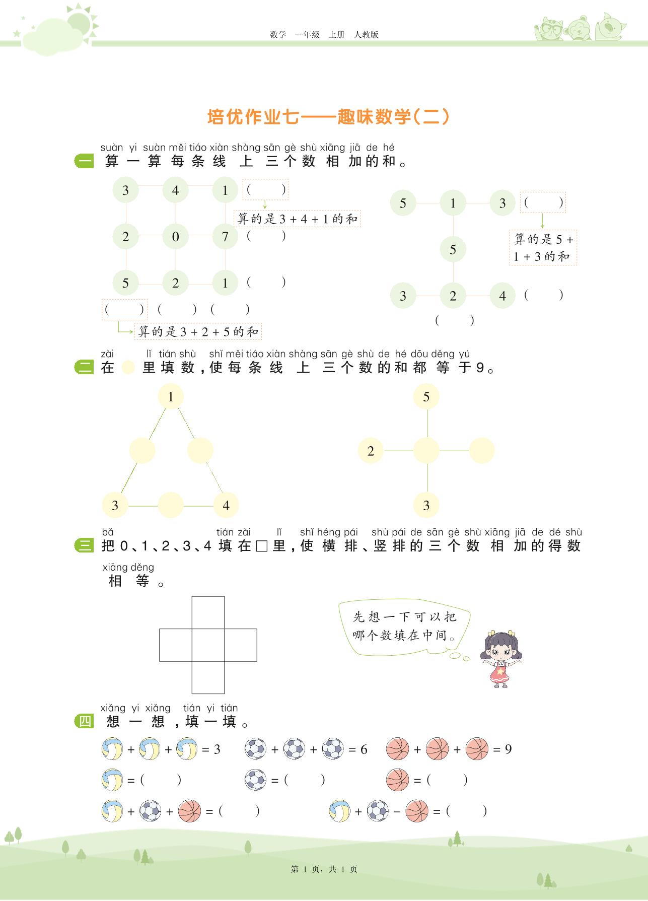 2020上册一年级数学人教版 第五单元——培优作业七——趣味数学(二)