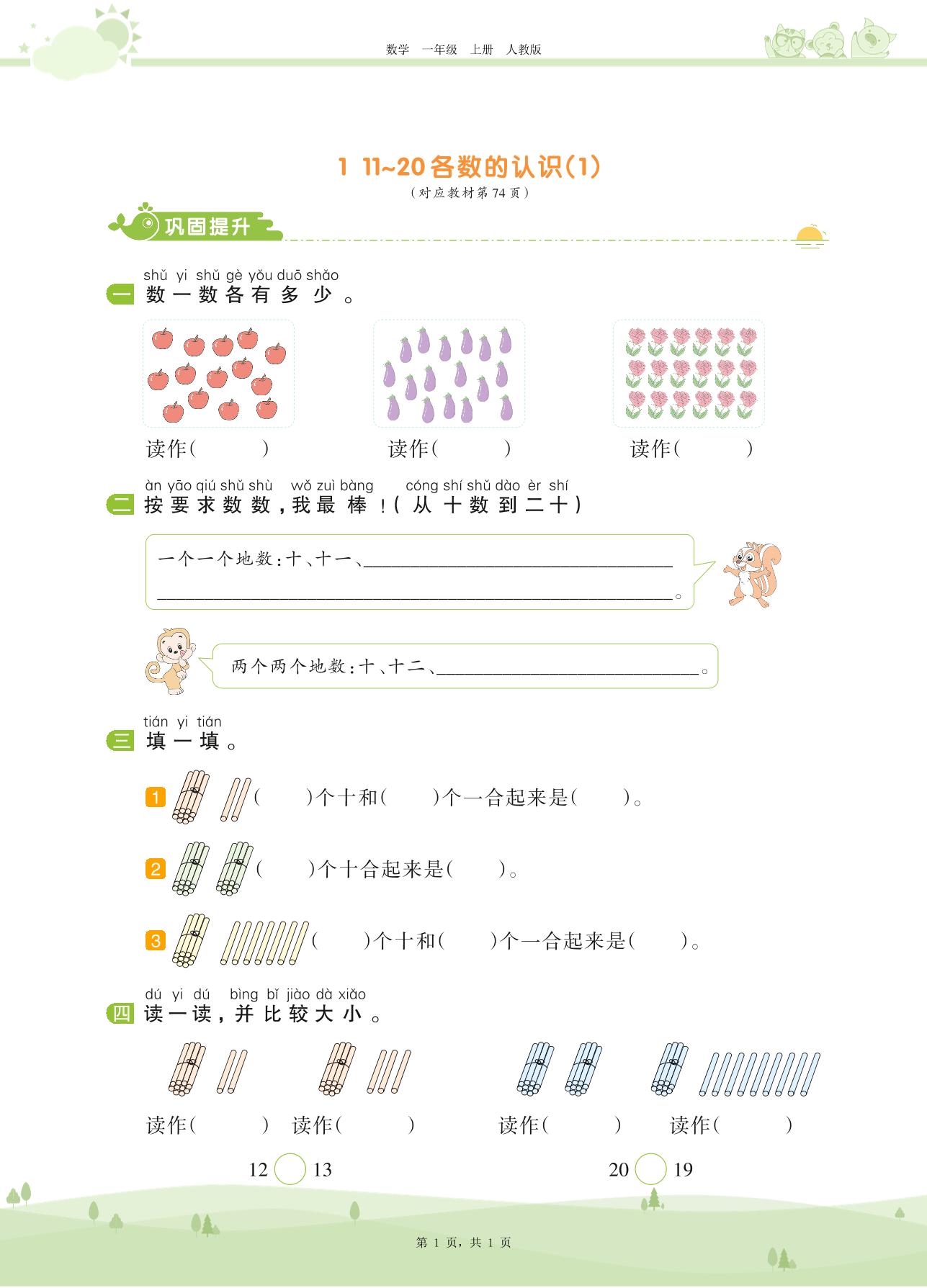2020上册一年级数学人教版 第六单元——1 11~20各数的认识(1)