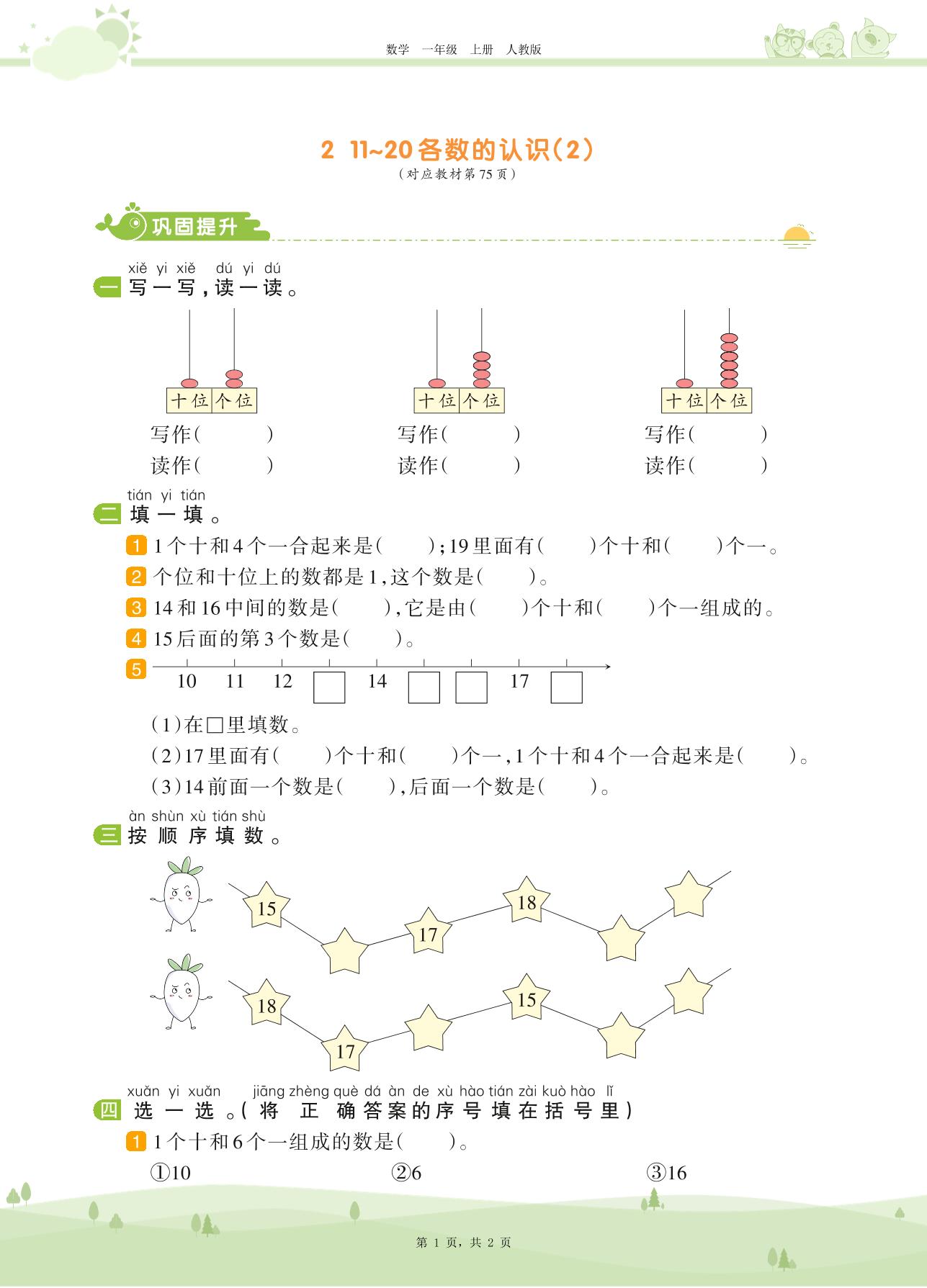 2020上册一年级数学人教版 第六单元——2 11~20各数的认识(2)