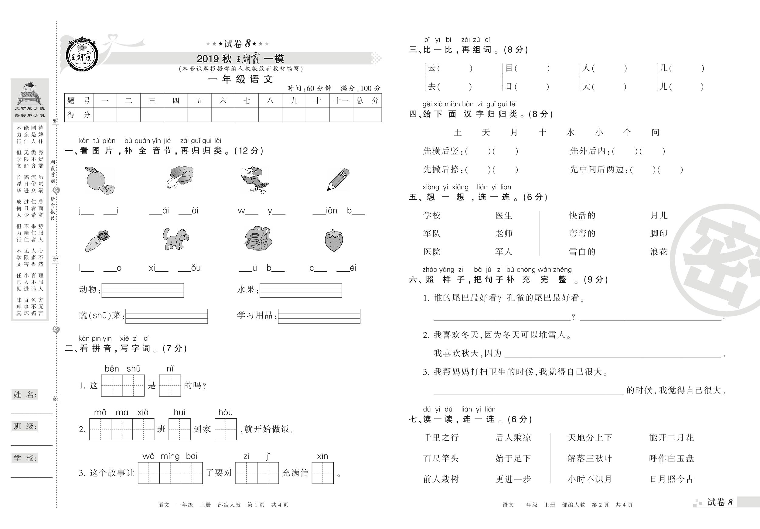 王朝霞期末模拟卷一年级上册语文(人教版)_R210731181042【8】
