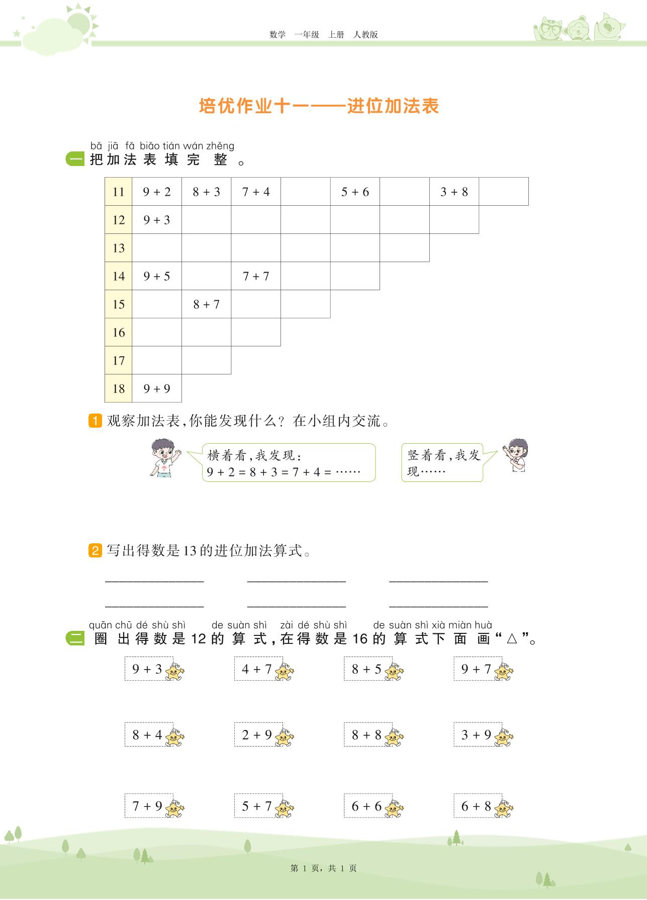 2020上册一年级数学人教版 第八单元——培优作业十一——进位加法表