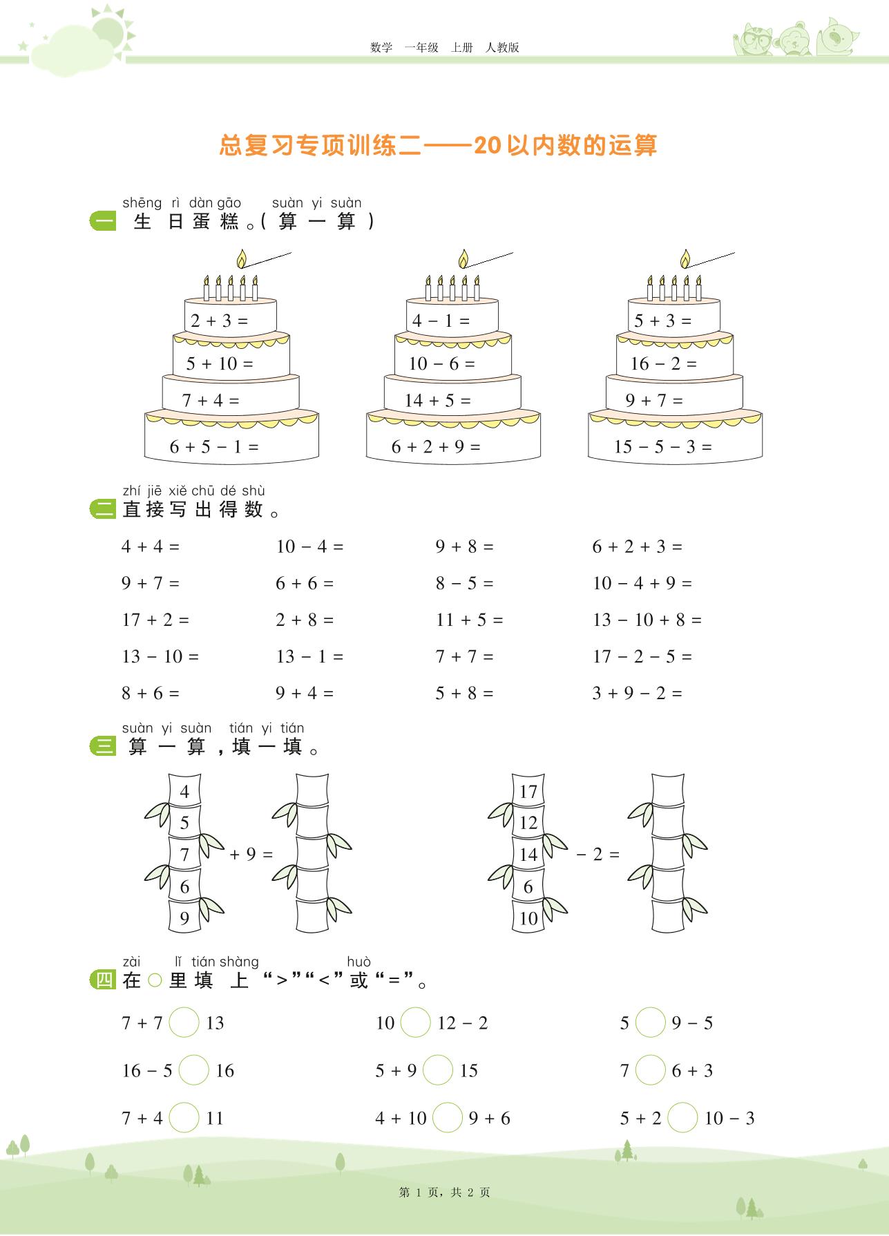 2020上册一年级数学人教版 第九单元——20以内数的运算