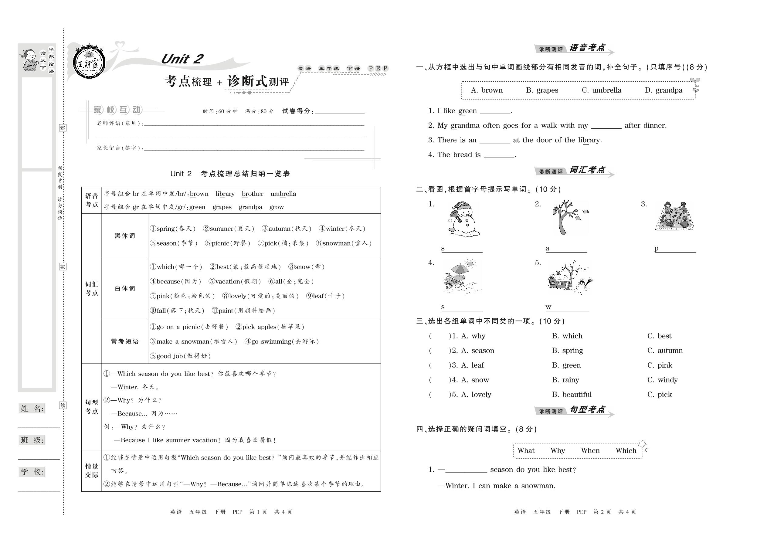 2021下册五年级英语PEP版 Unit 2 考点梳理+诊断式测评