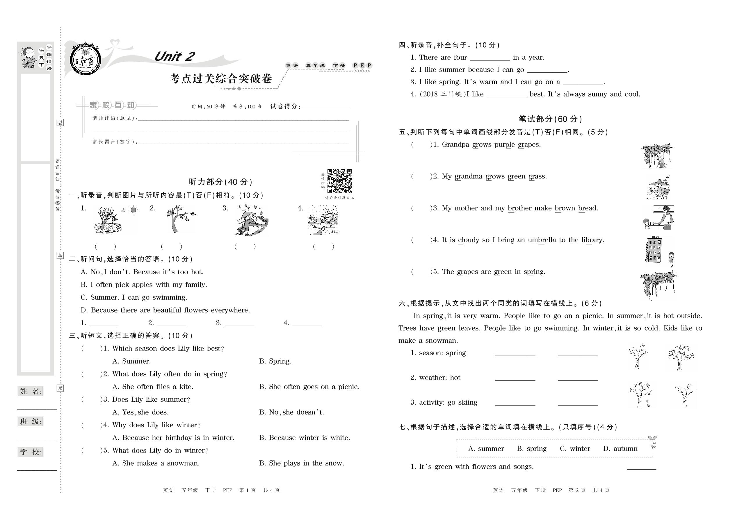 五年级英语人教PEP版(三起始)下册单元卷