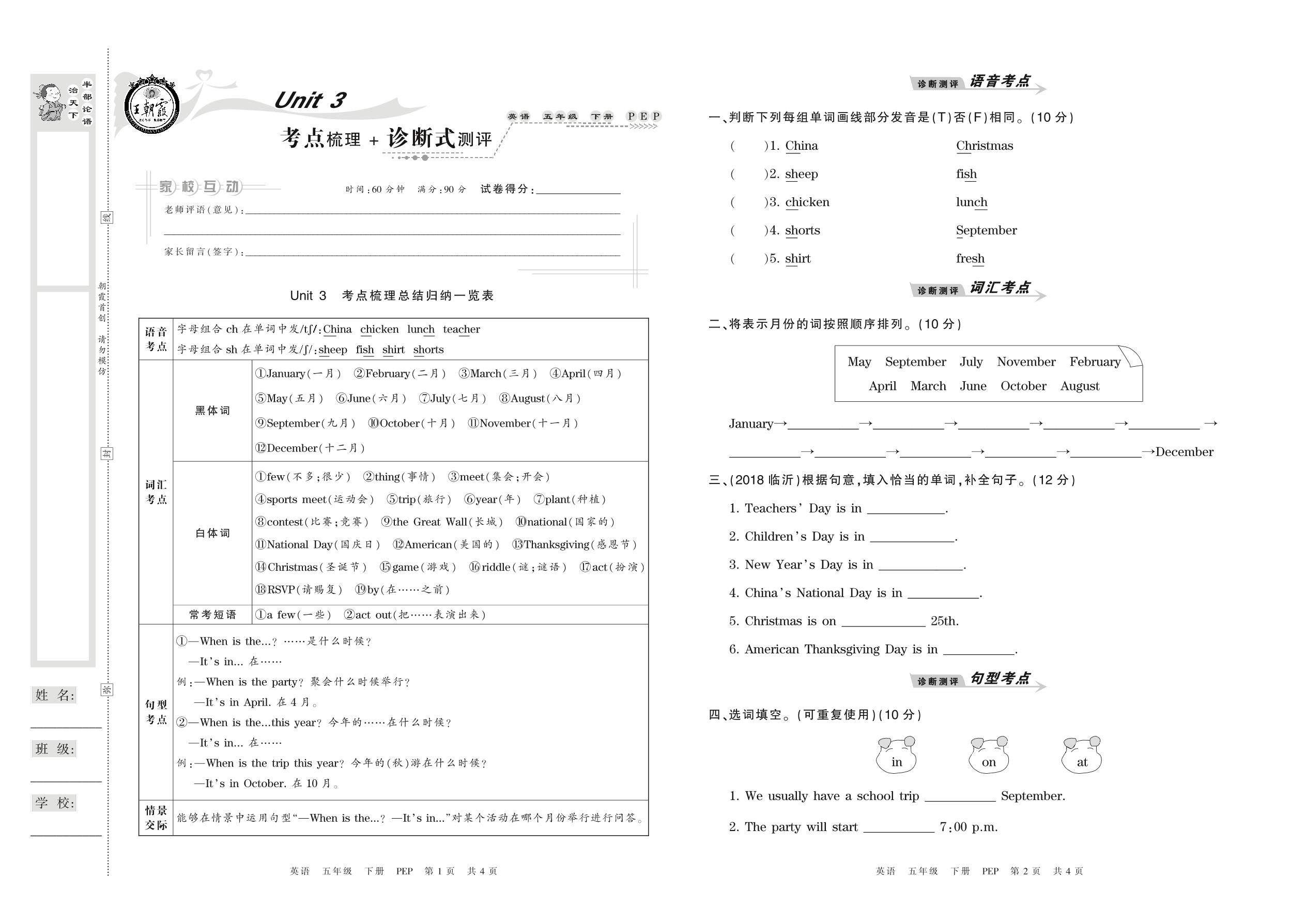 2021下册五年级英语PEP版 Unit 3 考点梳理+诊断式测评