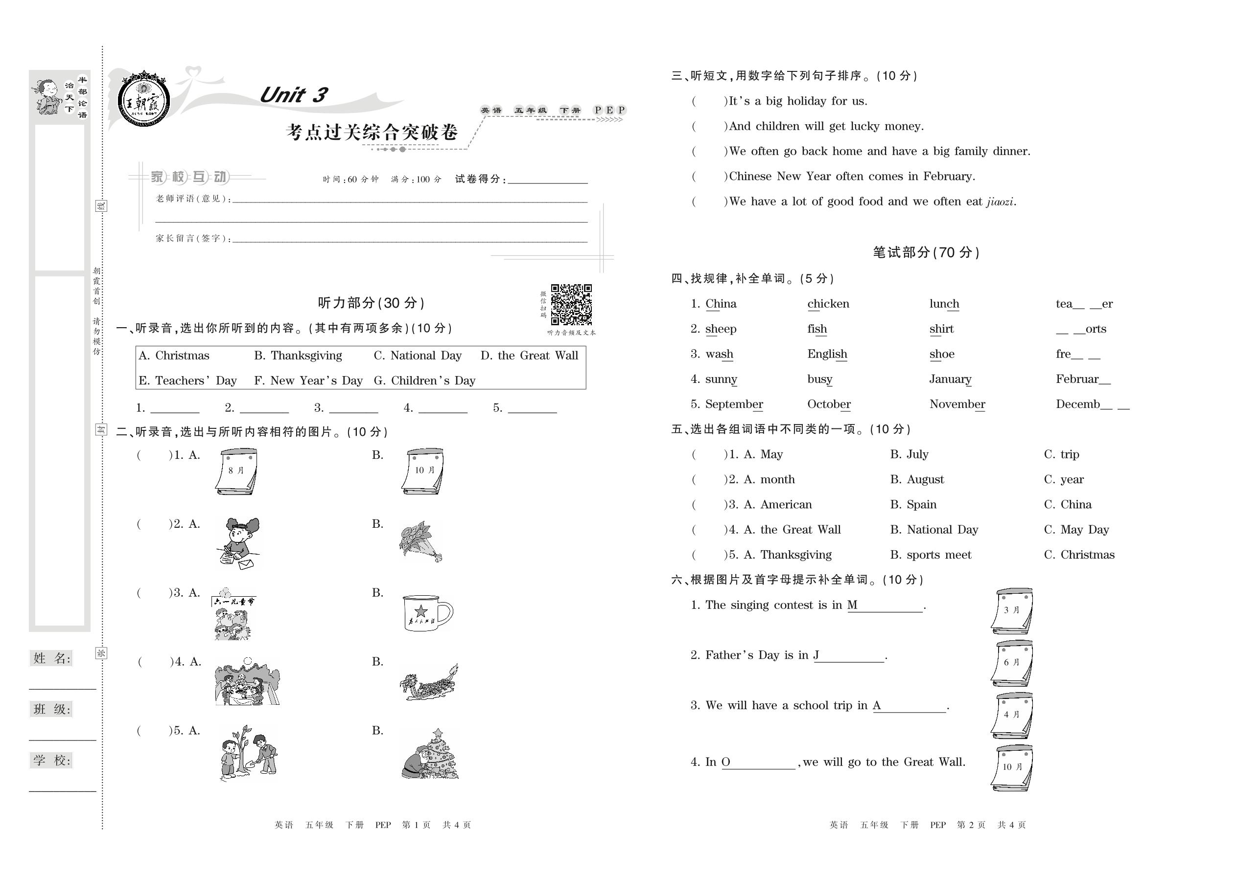 五年级英语人教PEP版(三起始)下册单元卷