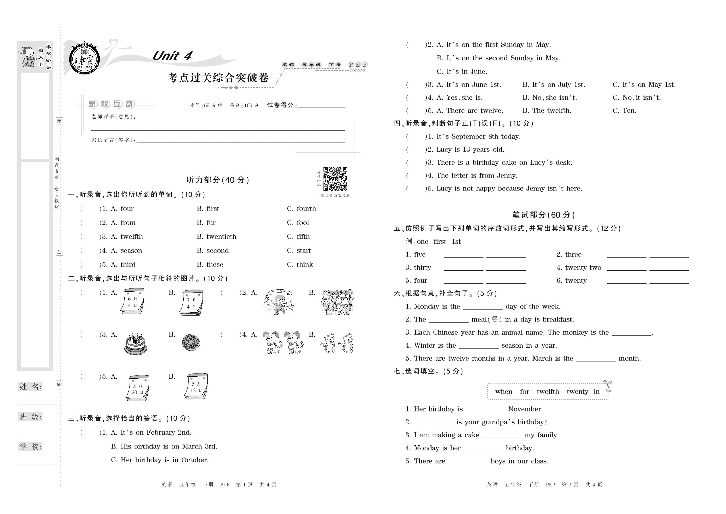2021下册五年级英语PEP版 Unit 4 考点过关综合突破卷