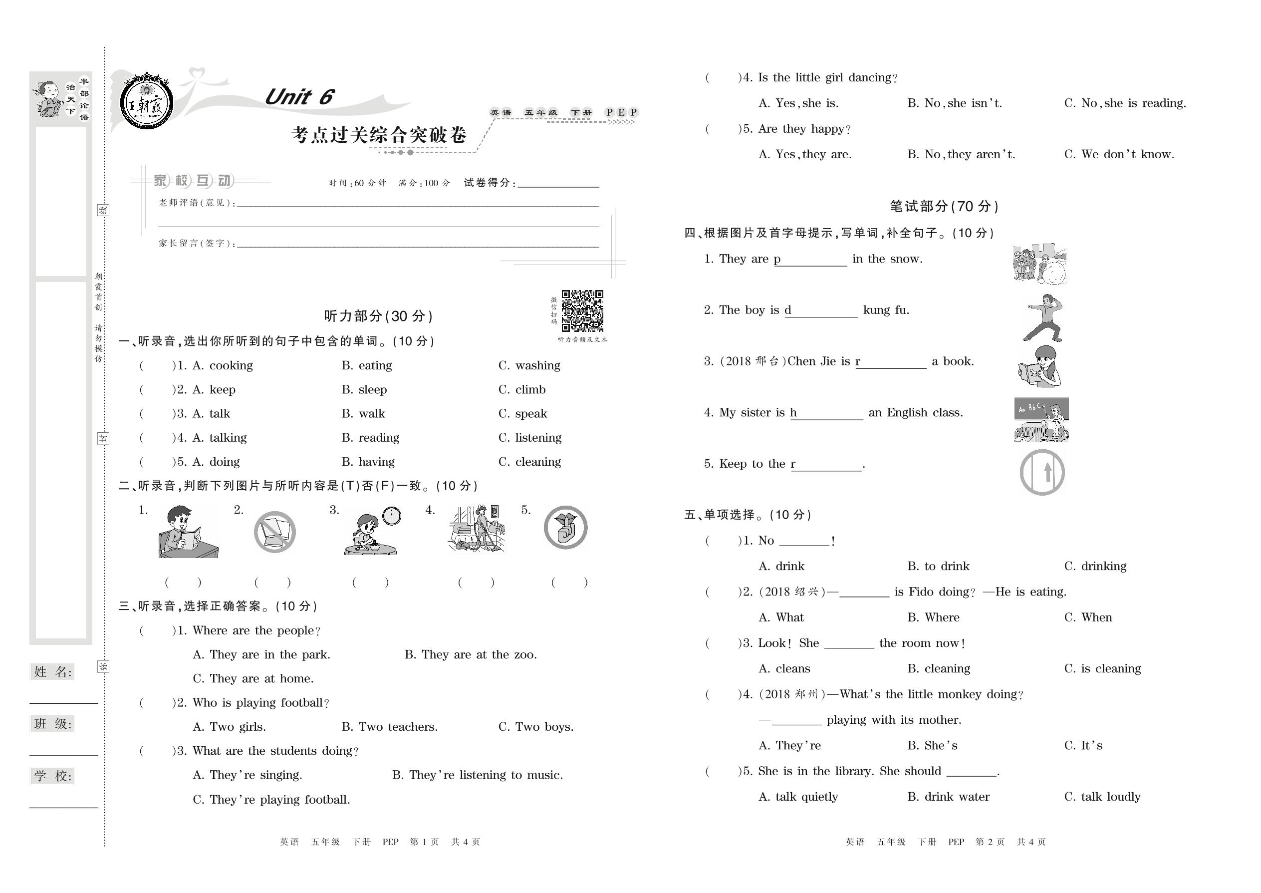 2021下册五年级英语PEP版 Unit 6 考点过关综合突破卷