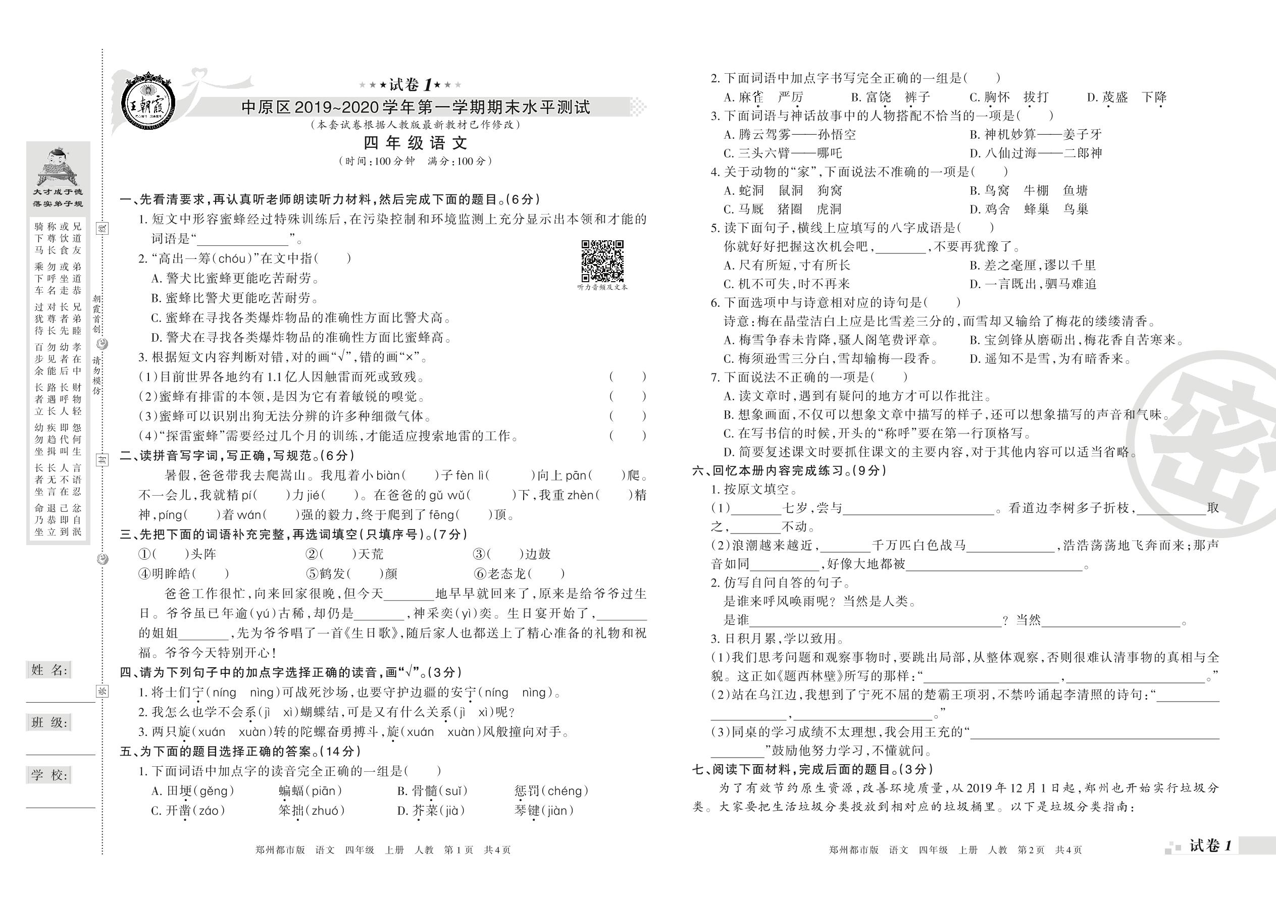 2019-2020学年第一学期郑州市中原区四年级语文试卷(人教版)_R210801191206【1】