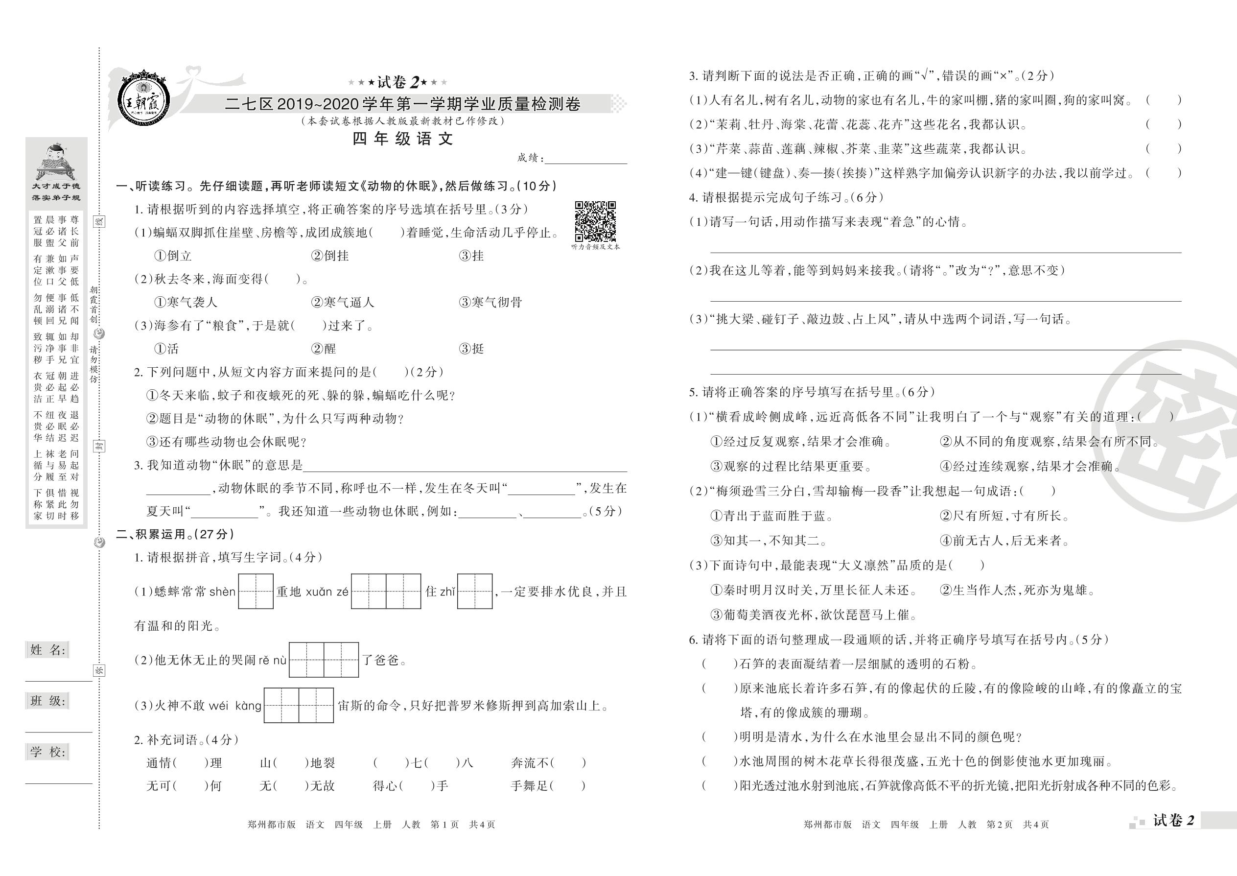 2019-2020学年第一学期郑州市二七区四年级语文试卷(人教版)_R210801191226【2】