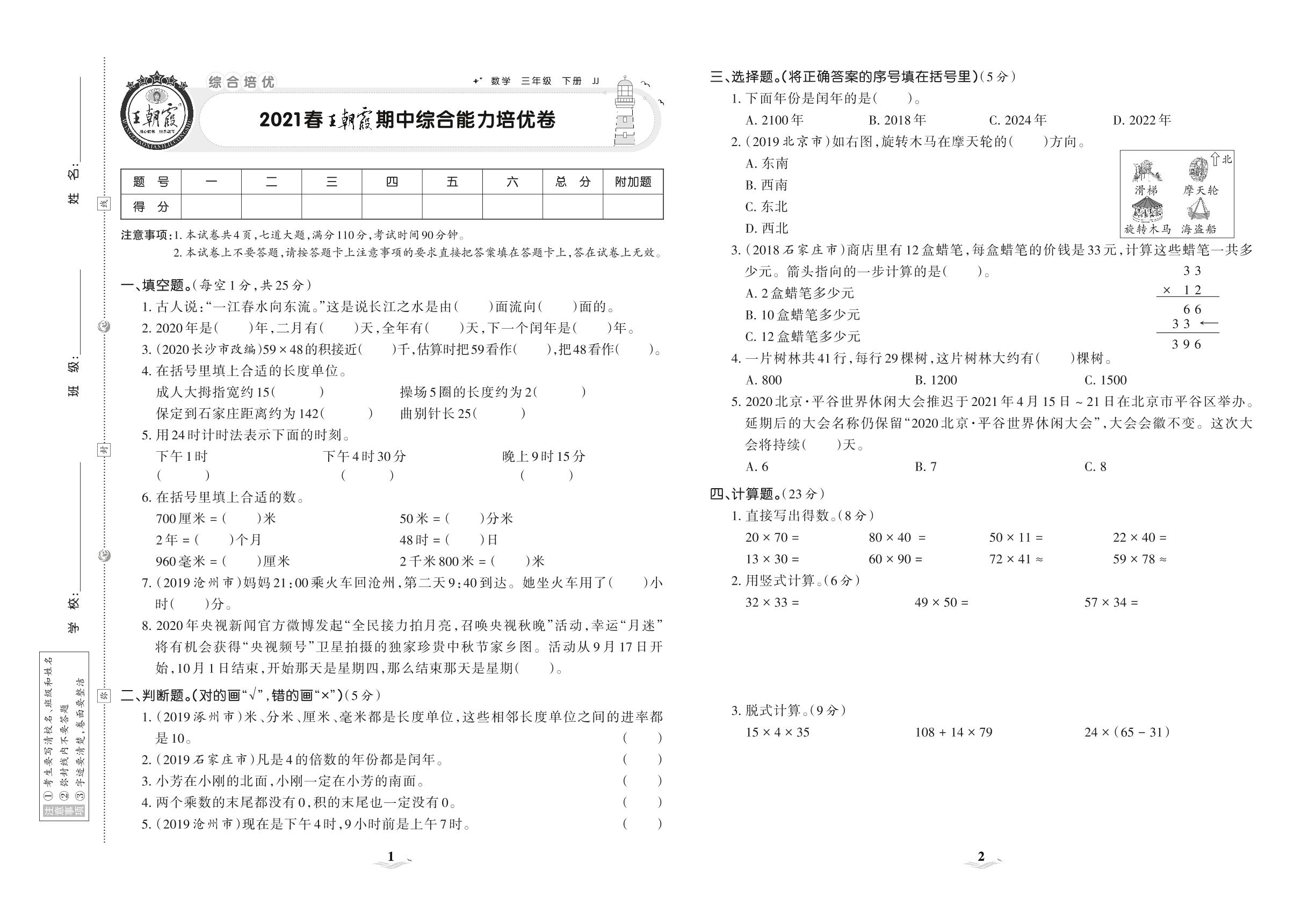 2021下册三年级数学冀教版 王朝霞期中综合能力培优卷