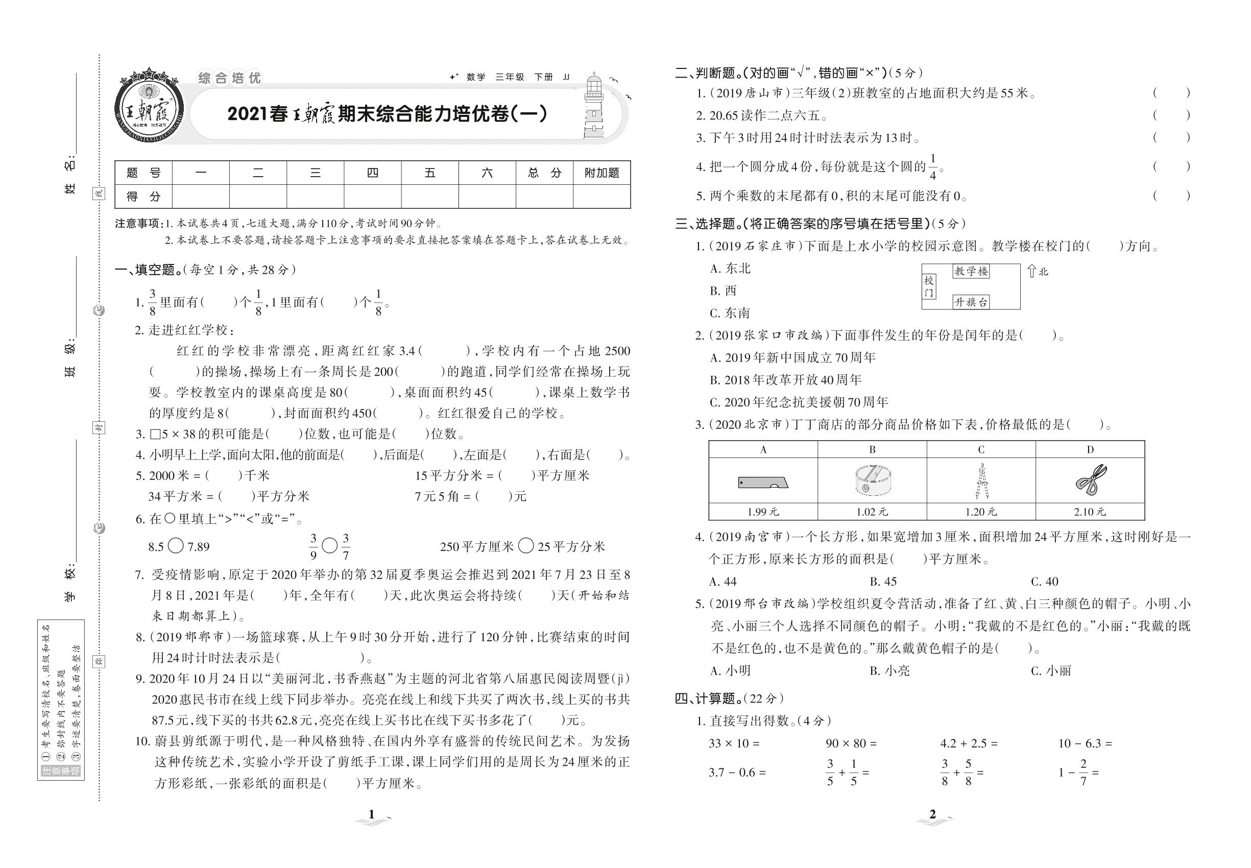 2021下册三年级数学冀教版 王朝霞期末综合能力培优卷(一)