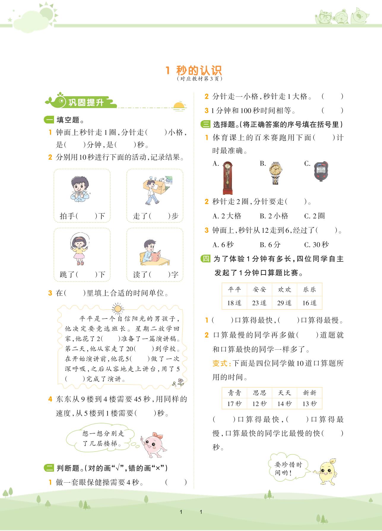 2020上册三年级数学人教版 第一单元 时、分、秒——1 秒的认识