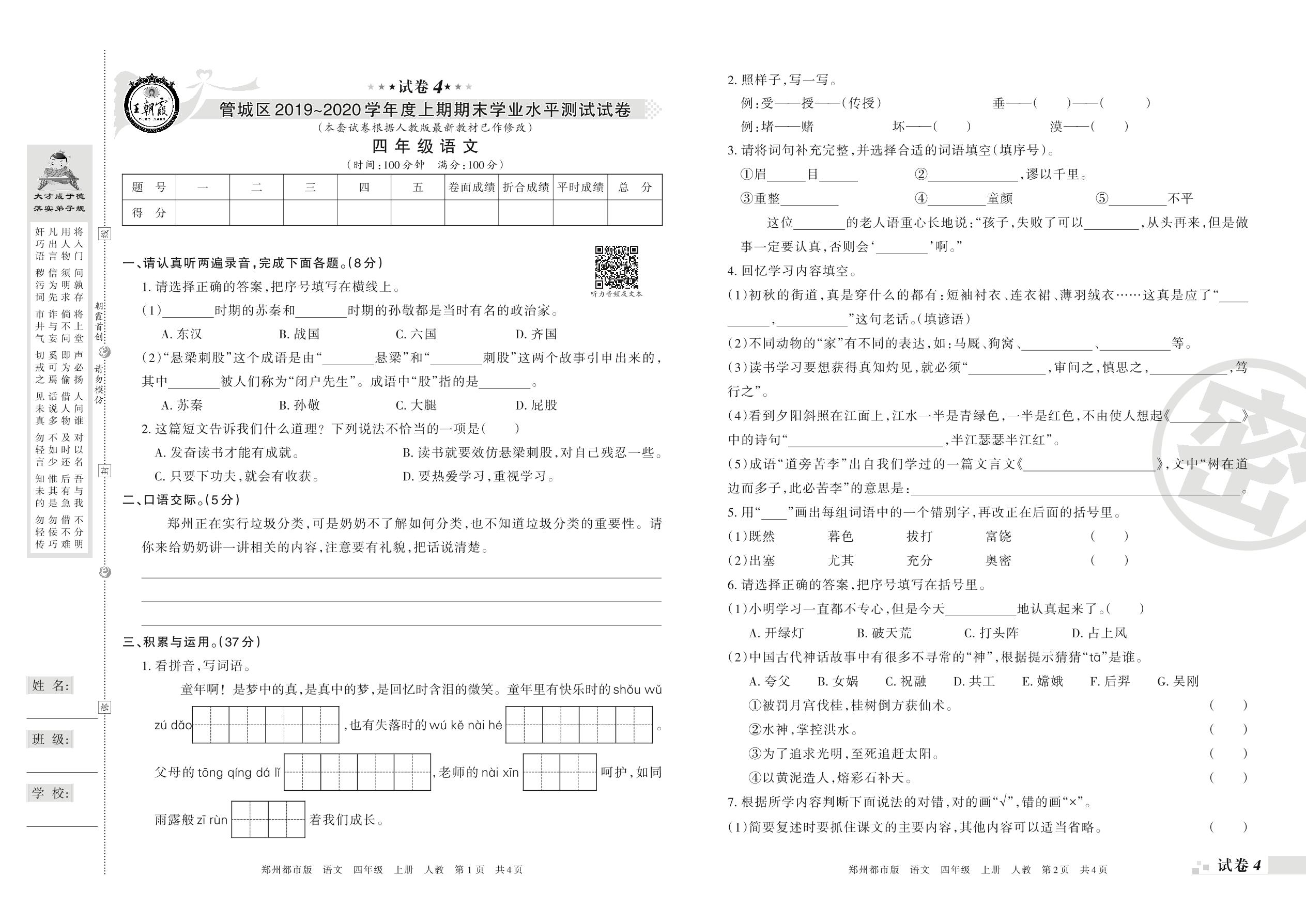 2019-2020学年第一学期郑州市管城区四年级语文试卷(人教版)【4】