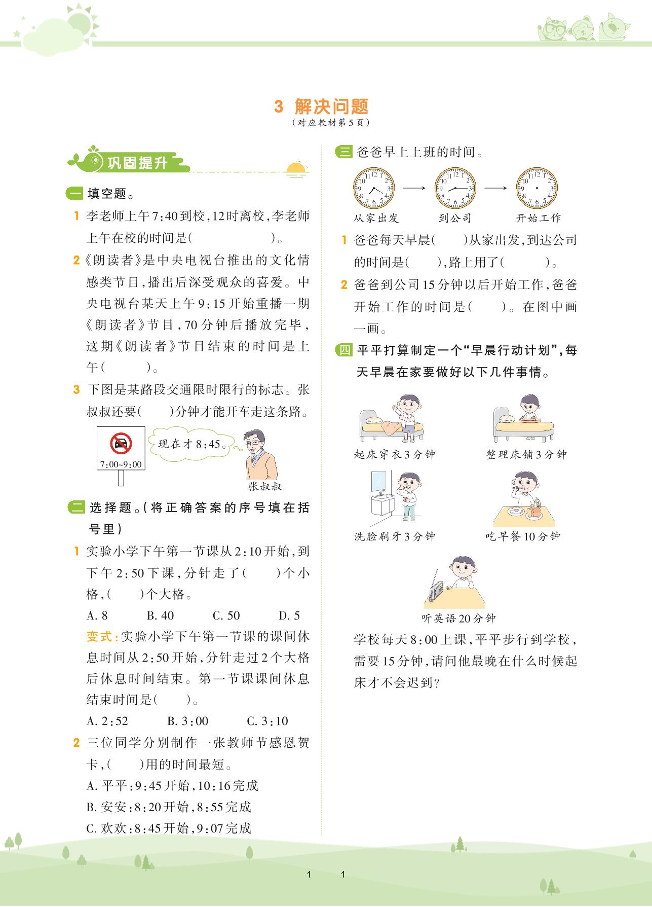 2020上册三年级数学人教版 第一单元 时、分、秒——3 解决问题