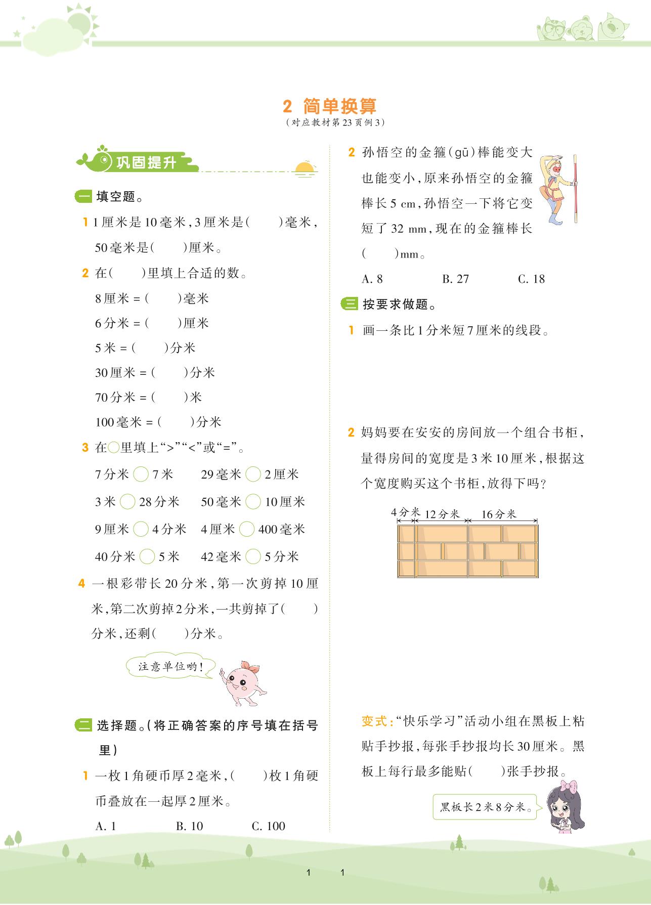 2020上册三年级数学人教版 第三单元 测 量——2 简单换算