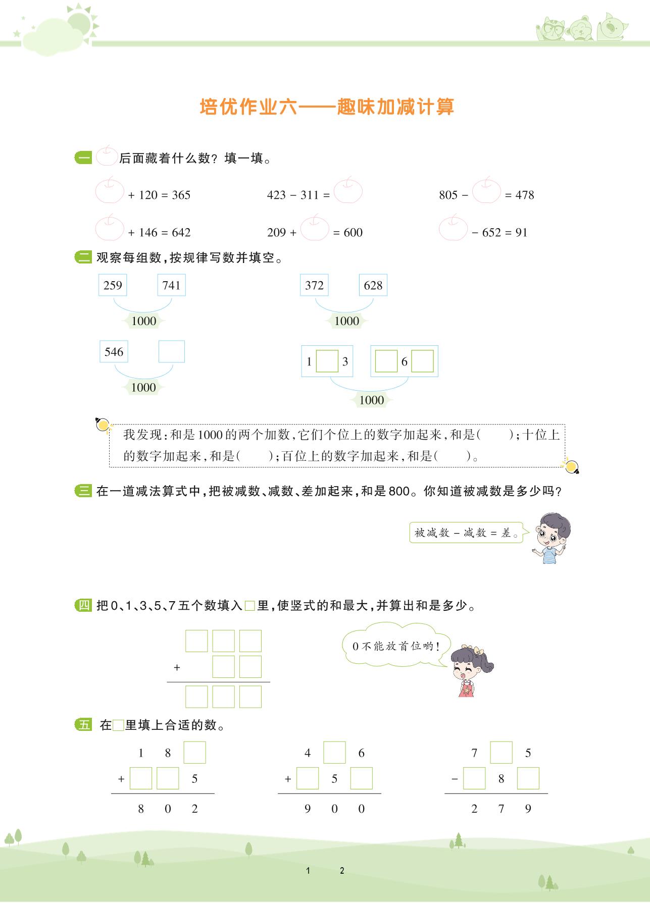 2020上册三年级数学人教版 第四单元 万以内的加法和减法(二)——培优作业六——趣味加减计算