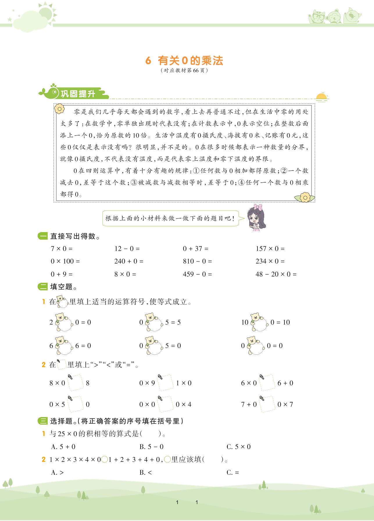 2020上册三年级数学人教版 第六单元 多位数乘一位数——6 有关0的乘法