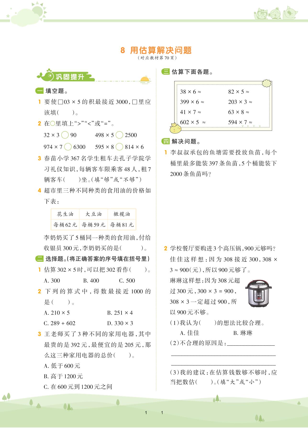 2020上册三年级数学人教版 第六单元 多位数乘一位数——8 用估算解决问题