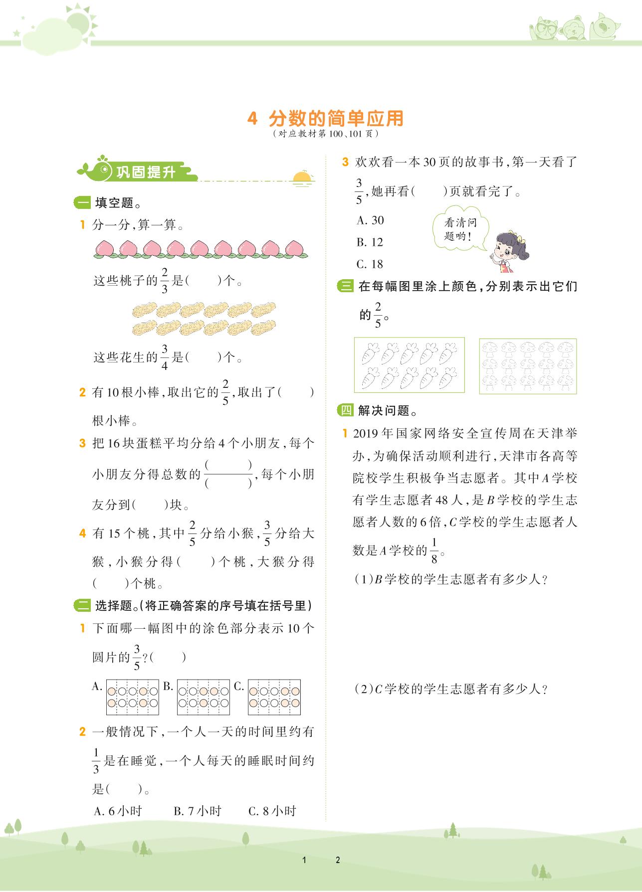2020上册三年级数学人教版 第八单元 分数的初步认识——4 分数的简单应用