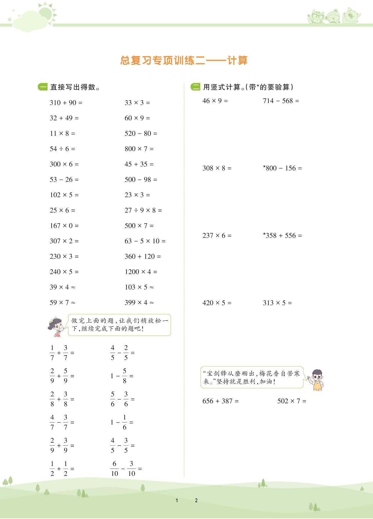 2020上册三年级数学人教版 第十单元 总复习——计算