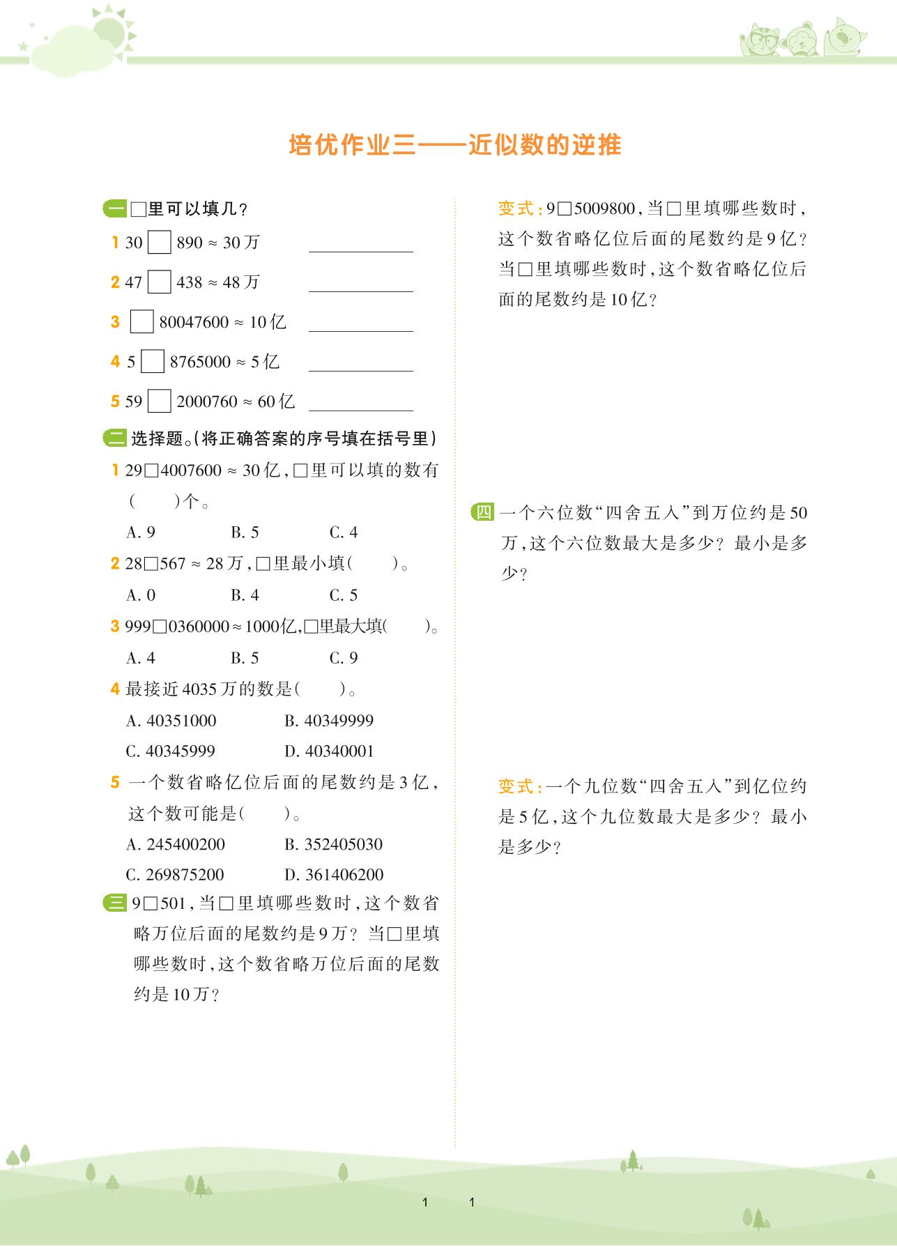 2020上册四年级数学人教版 第一单元 大数的认识——培优作业三——近似数的逆推