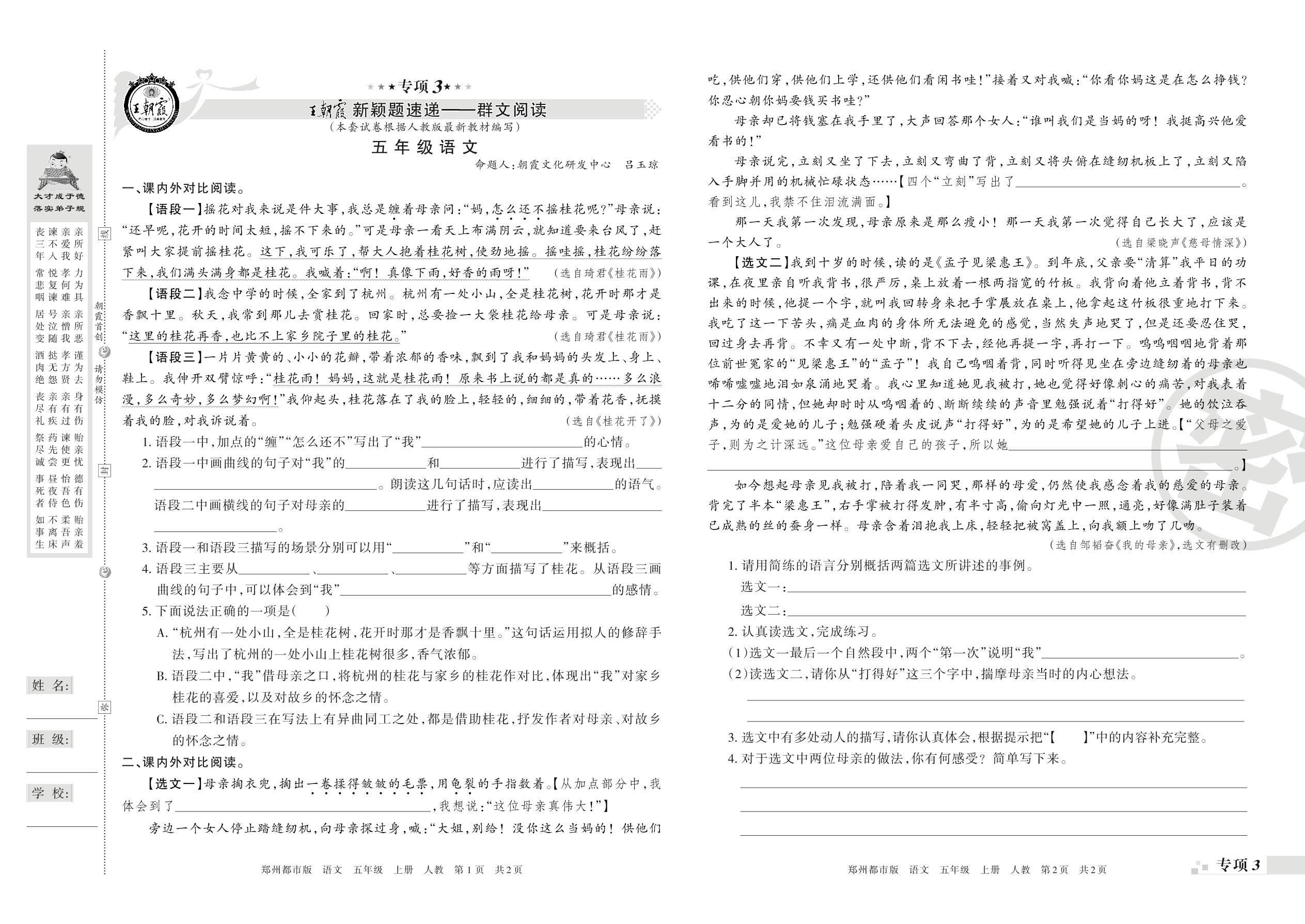 王朝霞期末专项卷——群文阅读、古诗文阅读五年级上册语文(人教版)_R210801191509【0】